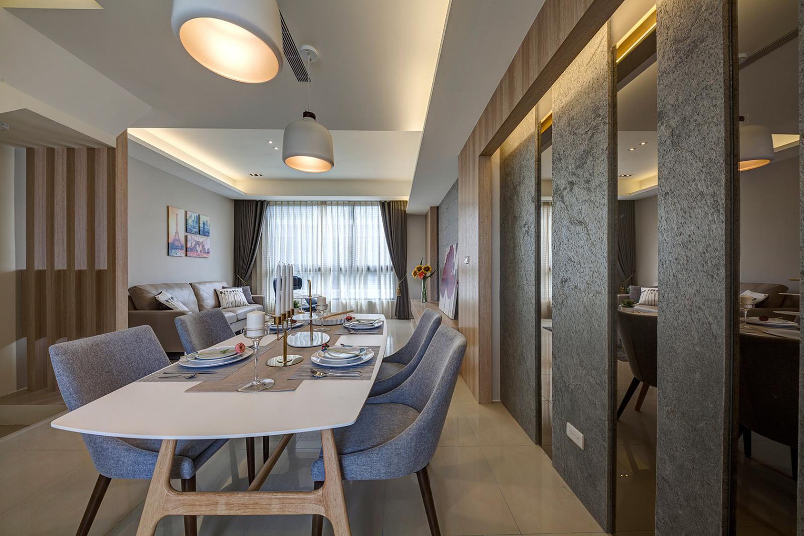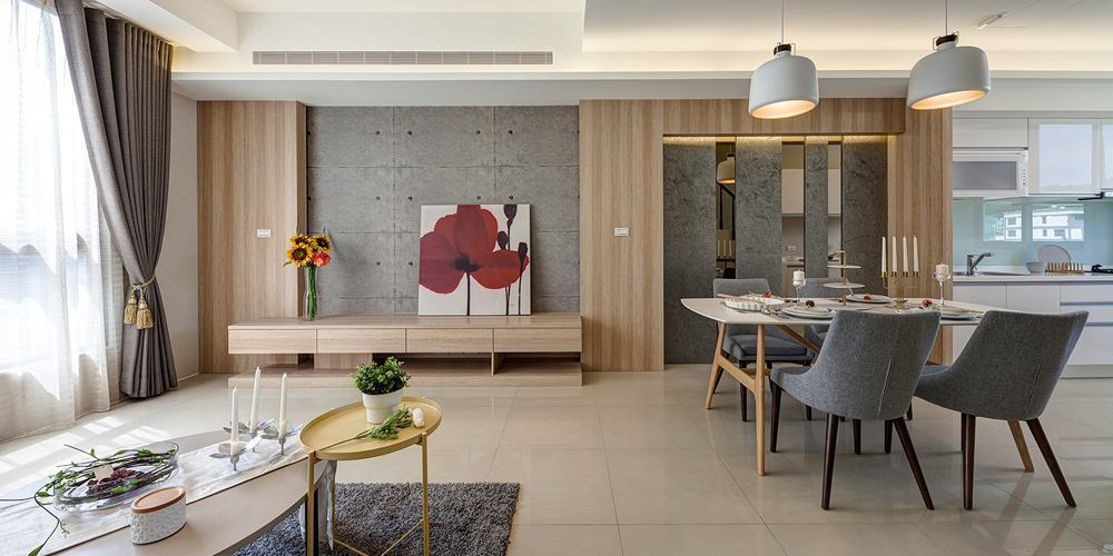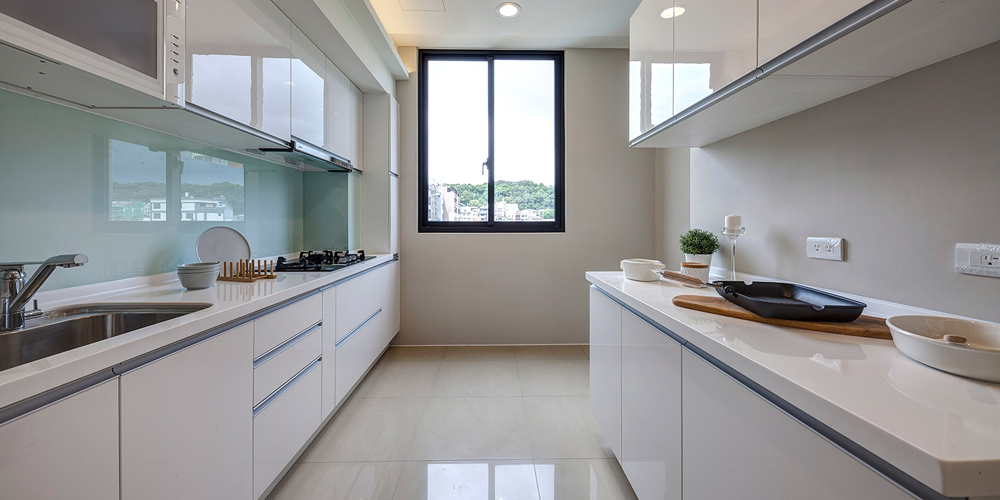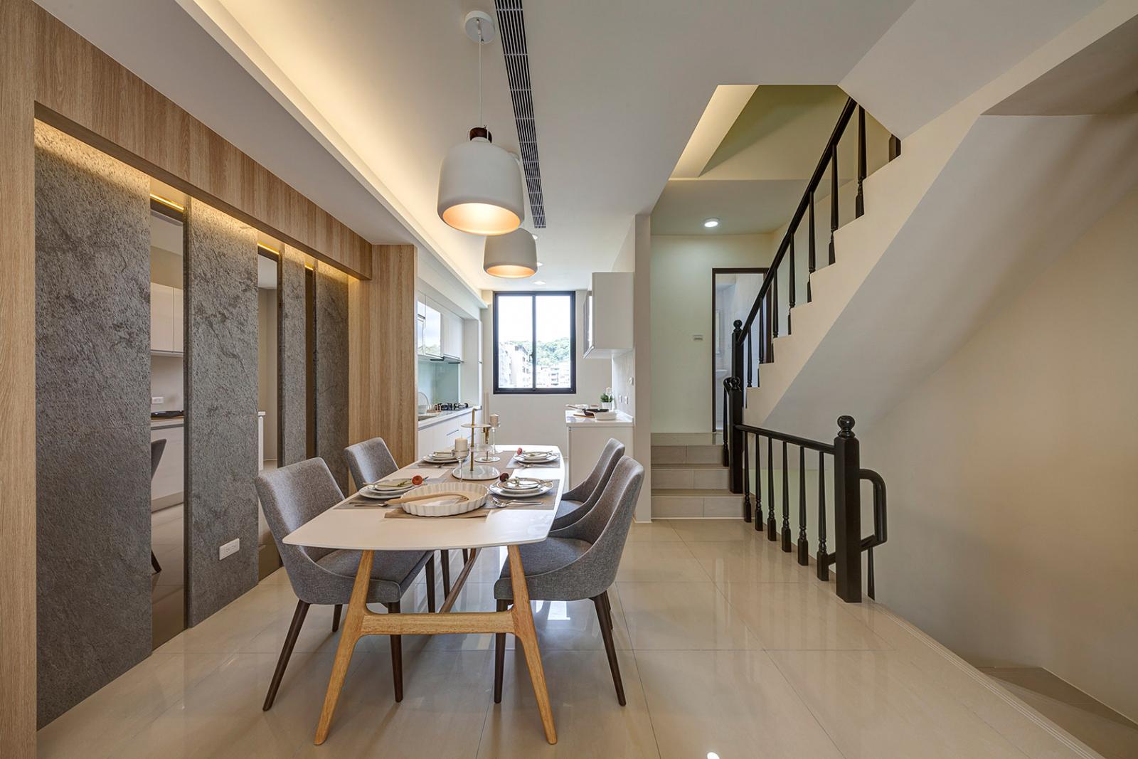 二樓規劃客廳、餐廳及廚房連成一線,開放式動線設計,規劃低檯度大面開窗,營造出更廣闊舒適的視覺感,廚具採豪山牌三口爐、抽油煙機、烘碗機等,並附後櫃檯面,可作為料理台及收納空間使用。