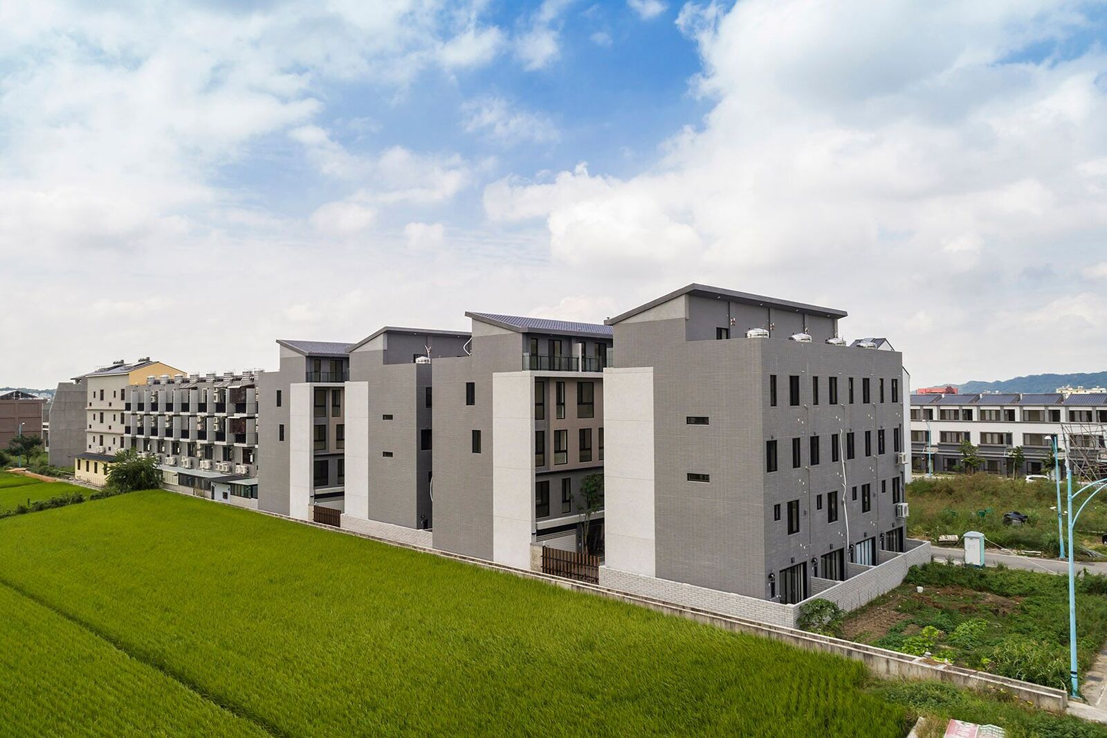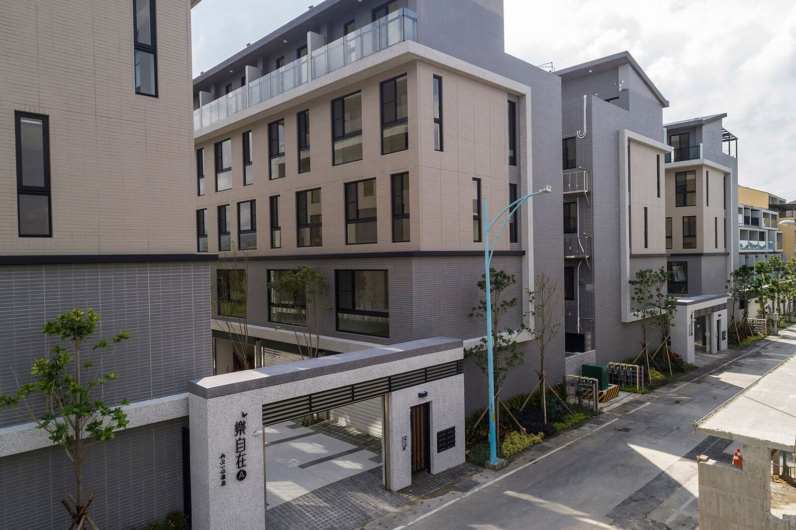 「樂自在」建築外觀以灰白色系為主軸,使用建材包括二丁掛、抿石子、鐵件欄杆、玻璃等,呈現出現代簡約及沉穩的建築風格;基地面積約375坪,總戶數16戶,規劃地上4樓半透天別墅,推出地坪22~27坪、建坪59~64坪,戶戶規劃四房、雙車位,總價1218~1298萬。