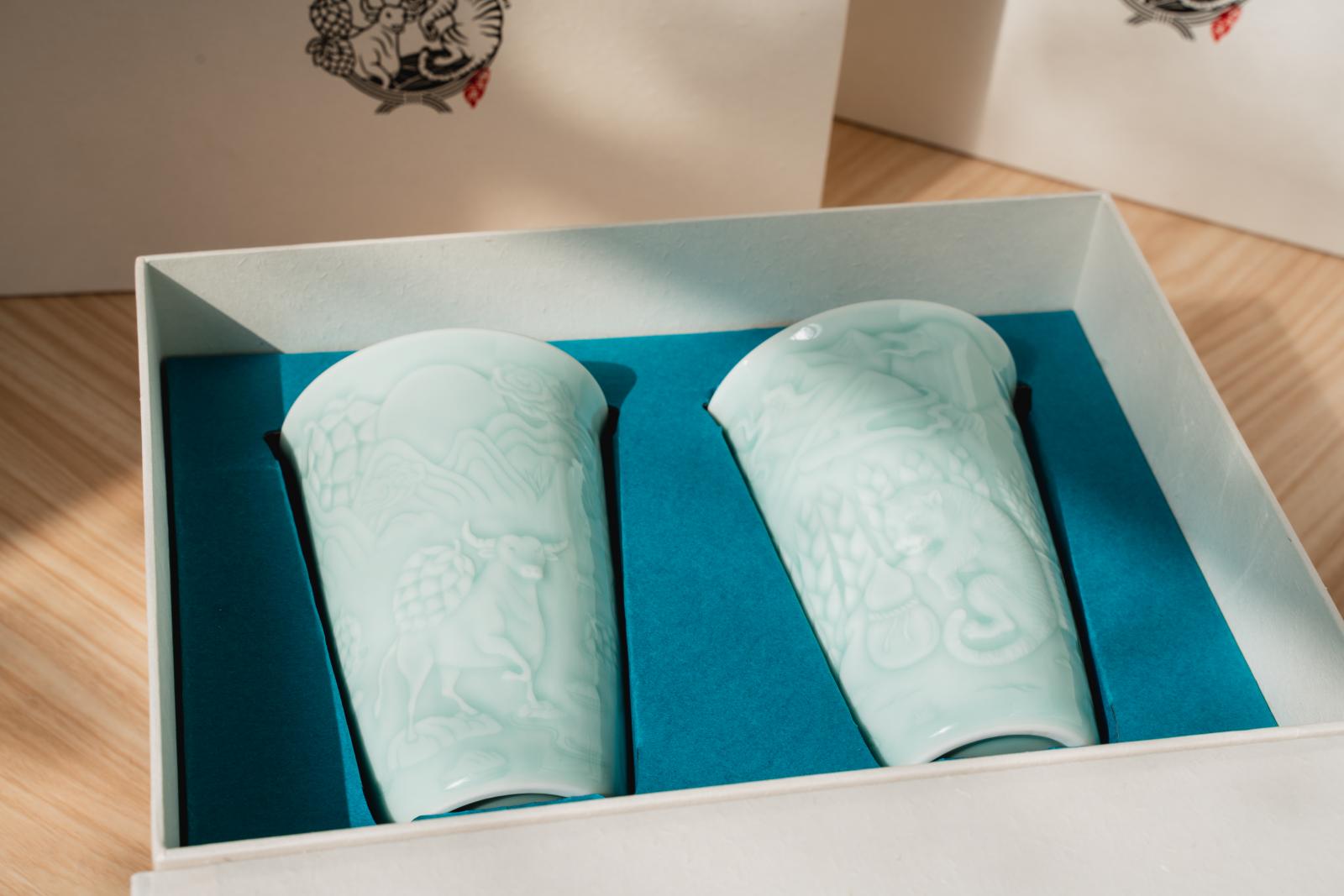 臺虎精釀與安達窯Anta Pottery推出【酒牛二虎對杯】結合瓷器、茶與創作茶酒杯對杯禮盒,在進行啤酒重新定義的市場革命再下一城。透過涉水摘花的野牛、跋山取麥穗的猛虎與葫蘆,重新詮釋「九牛二虎」的意象。透過安達窯極致的製陶工藝,燒製出兩只雕工細緻、色澤圓潤的陶瓷對杯。