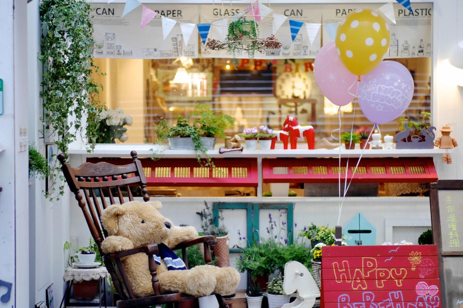 「從粉刷油漆、釘木板、找材料組裝桌子通通由她和先生Angus一手搞定!」在省下大幅裝潢費的前提下,他們決定自行DIY,加上先前有自家裝潢的經驗,讓他們更能清楚知道裝潢的需求及細節;為了打造不一樣的咖啡館,店內像是甜點展示櫃及牆壁木作都是由他們手工釘製而成;另外還有一張大型原木餐桌,夫妻倆特地前往高雄舊木行找到稀有珍貴的老船木,回來自行組裝完成;店內一道藍色木門,也是他們到高雄眷村找到的廢棄門,「舊物再造」概念,既環保又不浪費,同時讓咖啡館多了份老時代的美好記憶,新舊交融出不一樣的感受。
