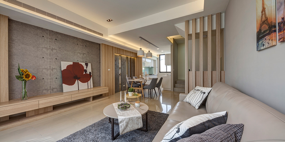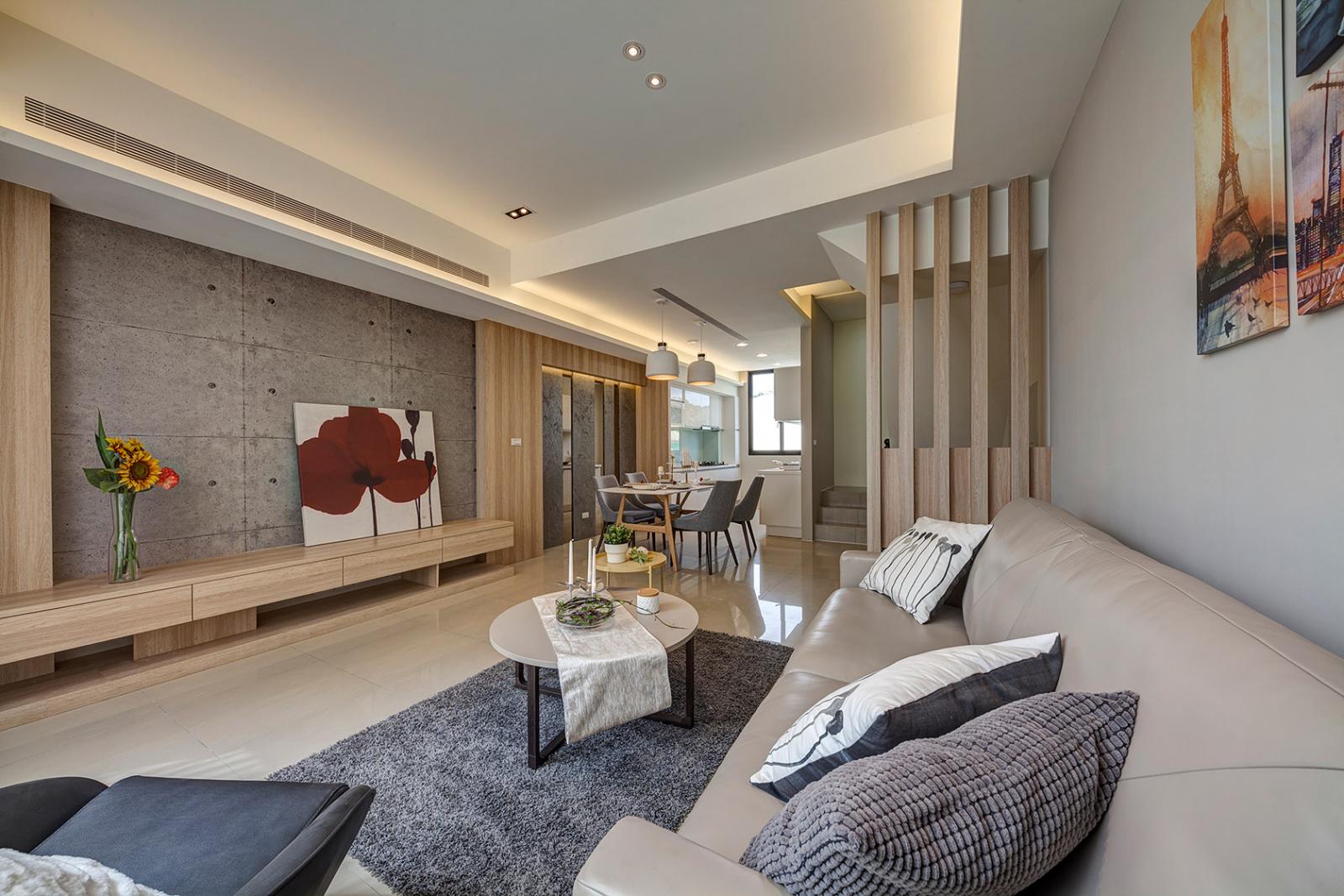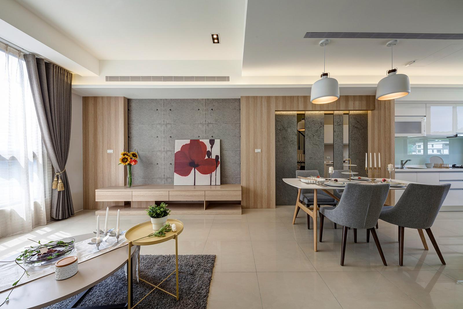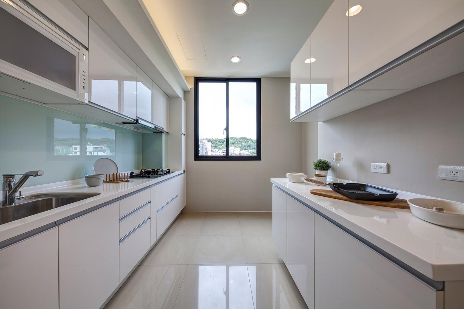 二樓規劃客廳、餐廳及廚房連成一線,開放式動線設計,規劃低檯度大面開窗,營造出更廣闊舒適的視覺感,廚具採豪山牌三口爐、抽油煙機、烘碗機等,並附後櫃檯面,可作為料理台及收納空間使用。