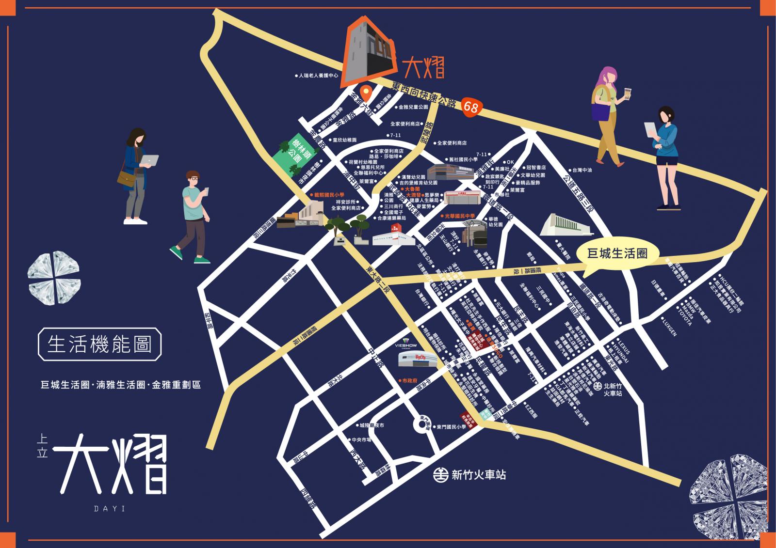 「大熠」基地座落新竹市金雅路、金雅六街口,攤開地圖來看,不但鄰近區內主要幹道之一的金雅路,離公園綠地、金雅社區活動中心、金雅門戶地標等都不遠,堪稱地處金雅精華特區!且金雅六街為8米道路,不但出入會車容易、不易塞車,採光通風也相對佳。
