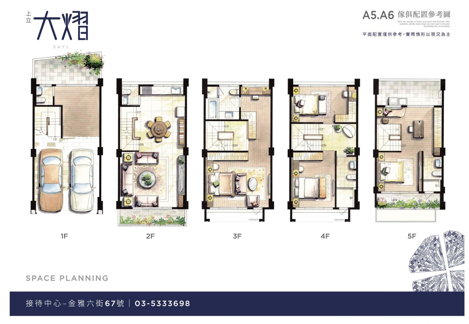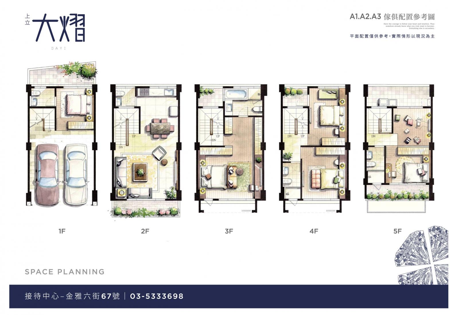 「大熠」格局規劃3-5房,1樓可停3部車或是將部分空間規劃為孝親房,2樓為客餐廳空間,舒適的大面開窗、陽台規劃,引入自然風使人身心舒暢;3樓為整層大主臥,衛浴乾溼分離、配備浴缸;4樓規劃2房可當小孩房或客房;頂樓預留彈性空間可自由規劃,像是和室、私家健身房或是神明廳都很合適,還有工作陽台可以洗衣曬被,空閒時站在陽台外面的景色,也是挺閒情逸致。