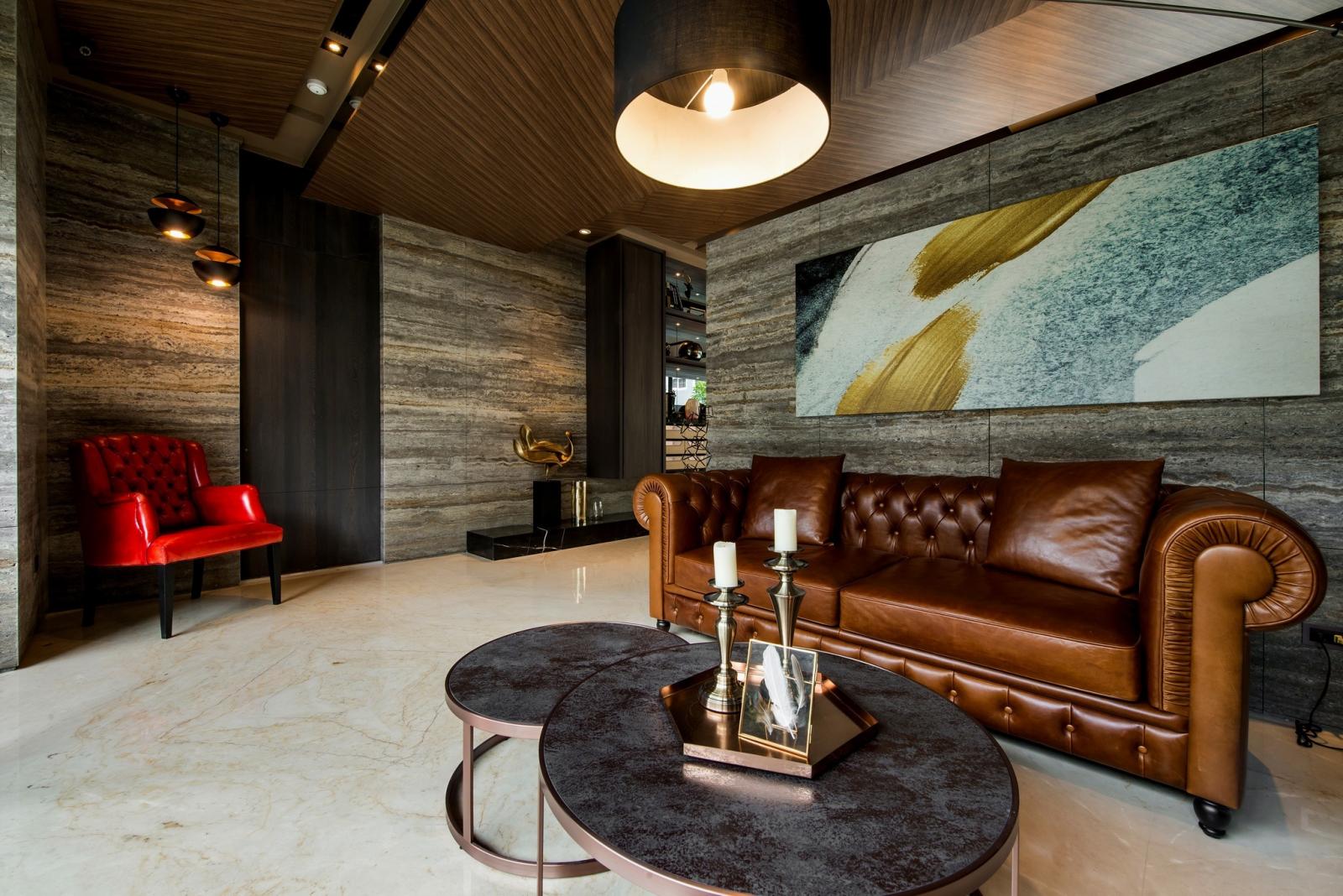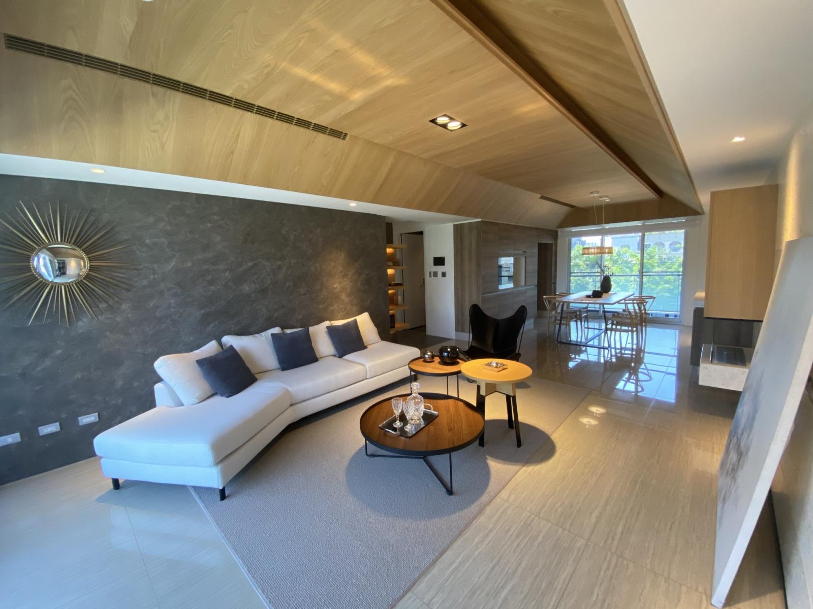 參與過涵碧樓頂級休旅飯店設計的王勝正設計師,擅長以東西合璧的設計語彙,特別在一樓打造宛若山水自然紋裡的銀灰洞石,以俐落大器的現代風格作為空間的線條、架構,呈現出住戶大隱於市的心境。