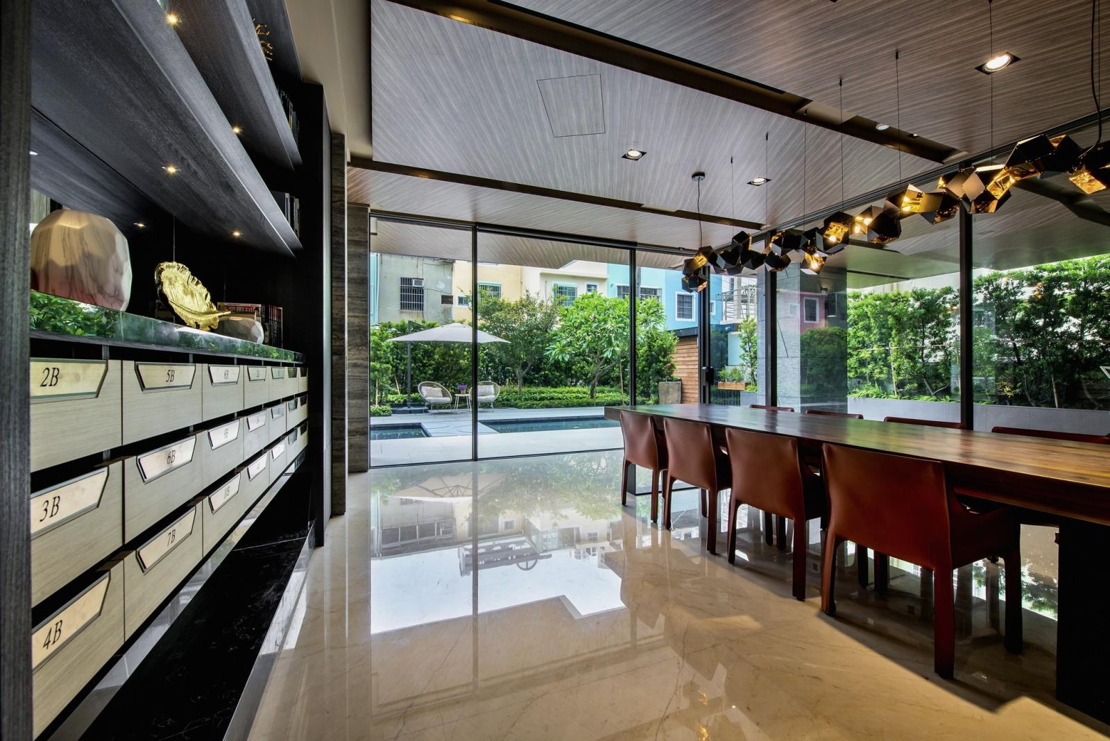 公設由屢獲多項國際大獎、亞洲人氣設計師的十邑設計王勝正規劃,大廳與公設空間結合美術館意象設計,藉由大面落地窗引景入室,透過視覺的延伸,讓室內空間與戶外聯結,藝術建築與自然完美共生。