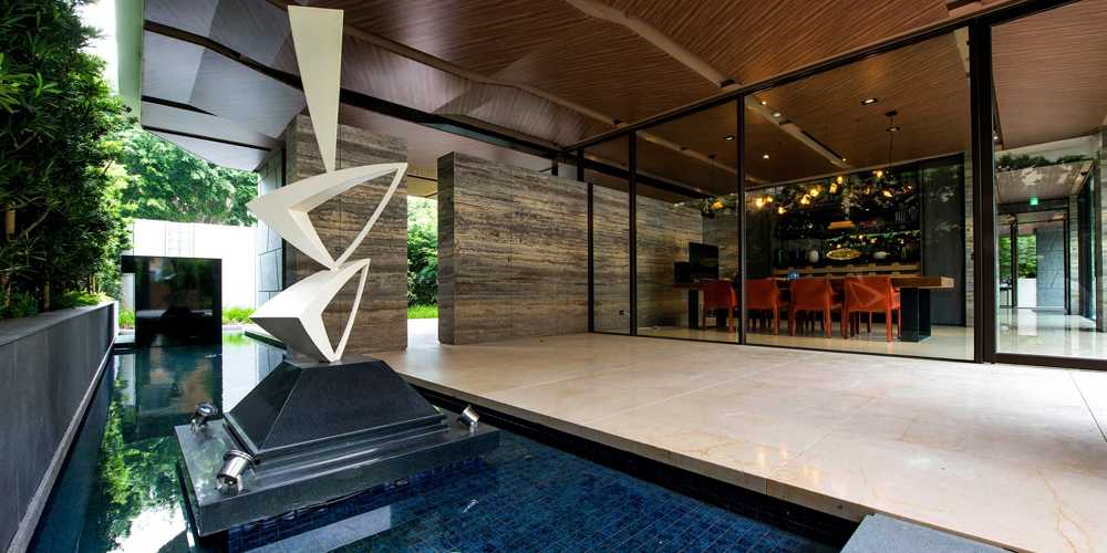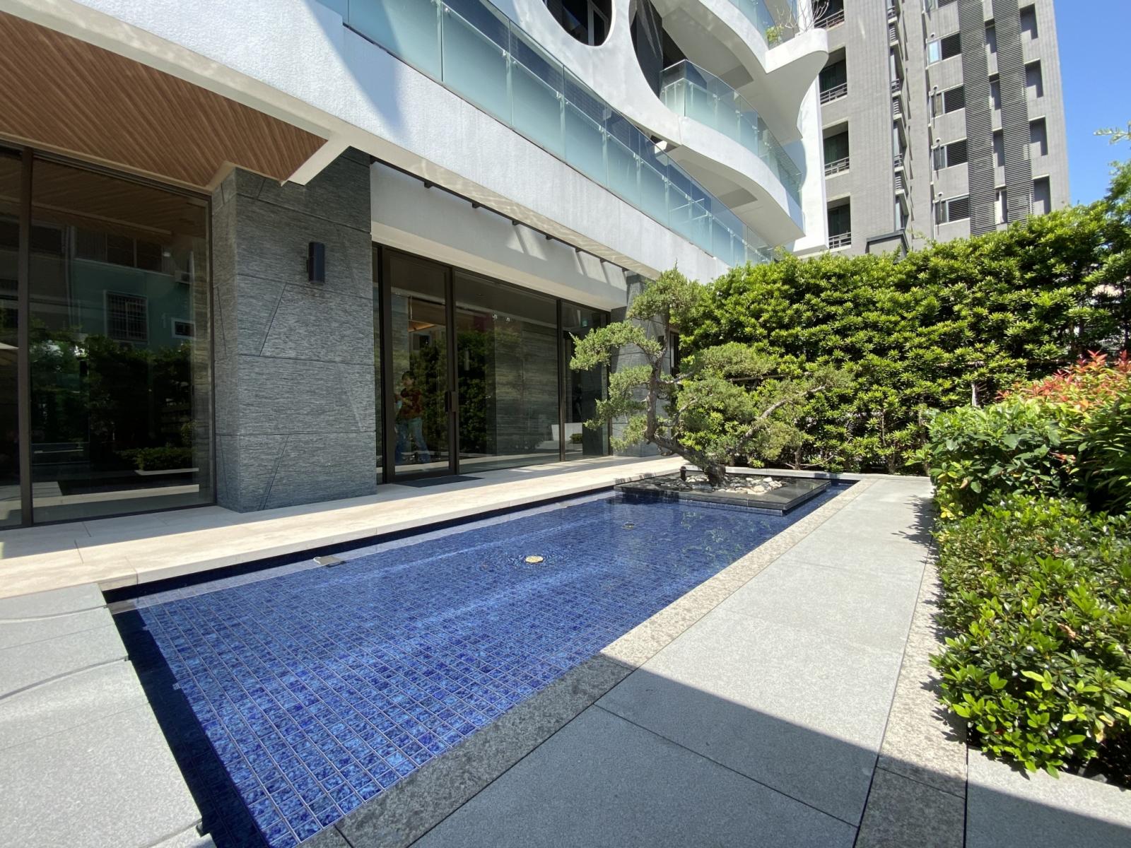 戶外區打造綠意水景,周圍設置樹籬圍牆,將國外休閒度假氛圍帶進社區,打造Urban Resort隱富住宅,營造出兼具有人文自然與高度私密安全的溫暖堡壘。