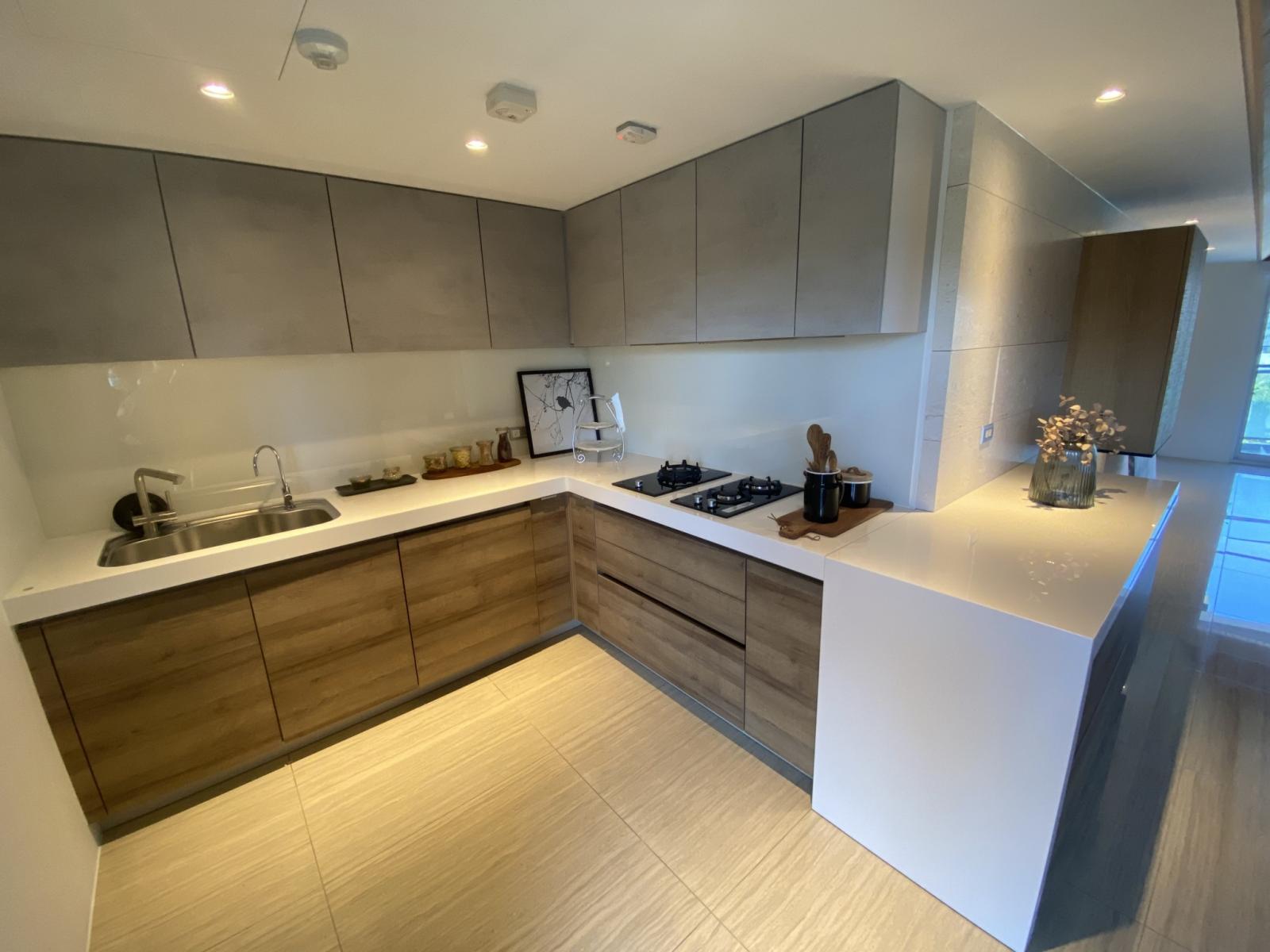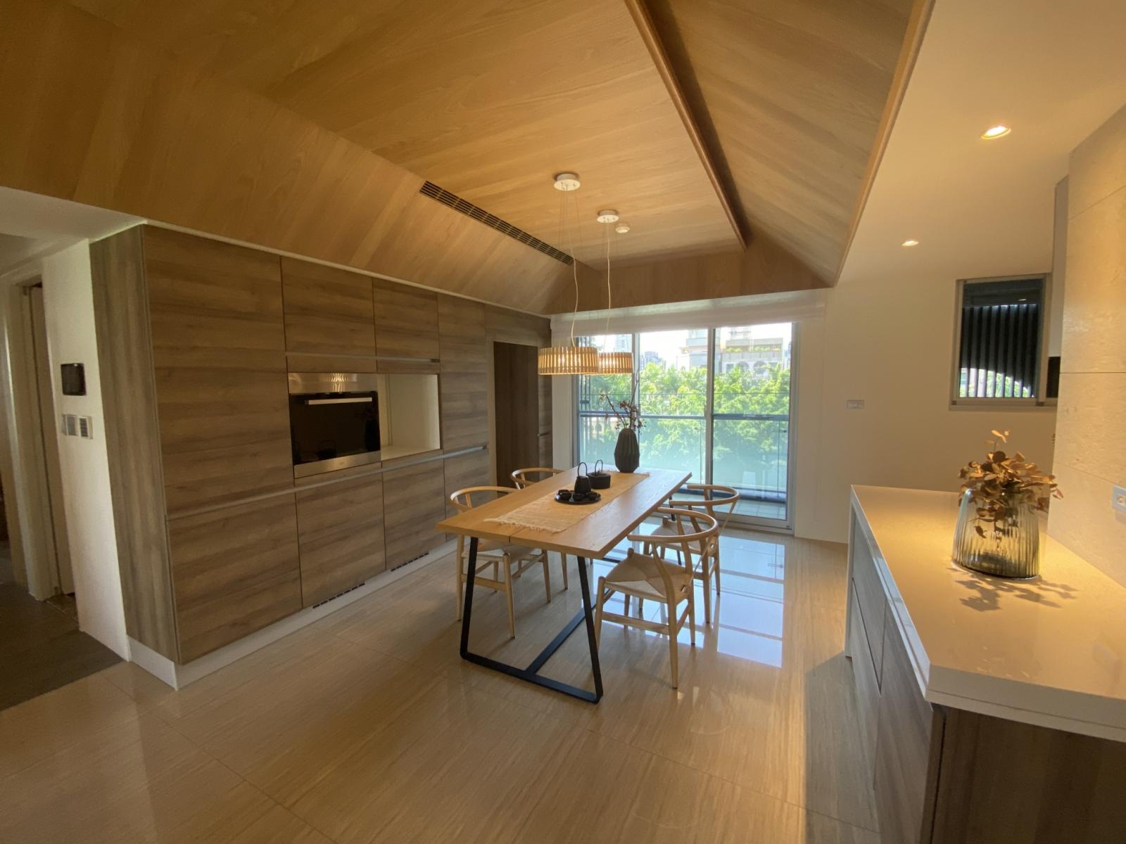 客餐廚串聯成開放大空間,前後面皆有開大窗,高樓層即享有雙園道綠意景觀,不論是一家人在客廳看電視、欣賞戶外景緻,或在廚房一起手做料理,擁有更親密的互動。