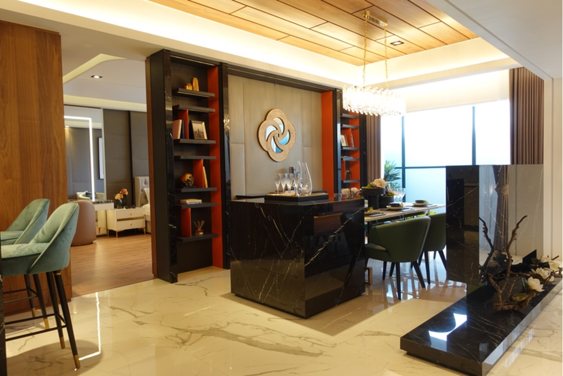 「泉宇雲鼎」接待中心現場打造A戶約66坪,規劃四房三衛浴,採邊間設計、三面採光,其中有兩間臥房為雙套房設計,整體尺度寬闊、動線流暢,空間彈性好運用。