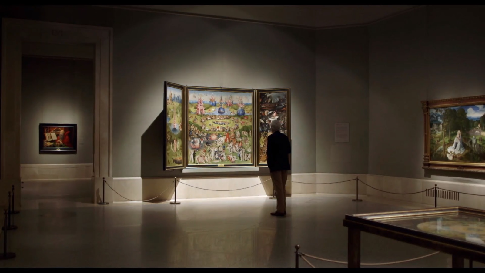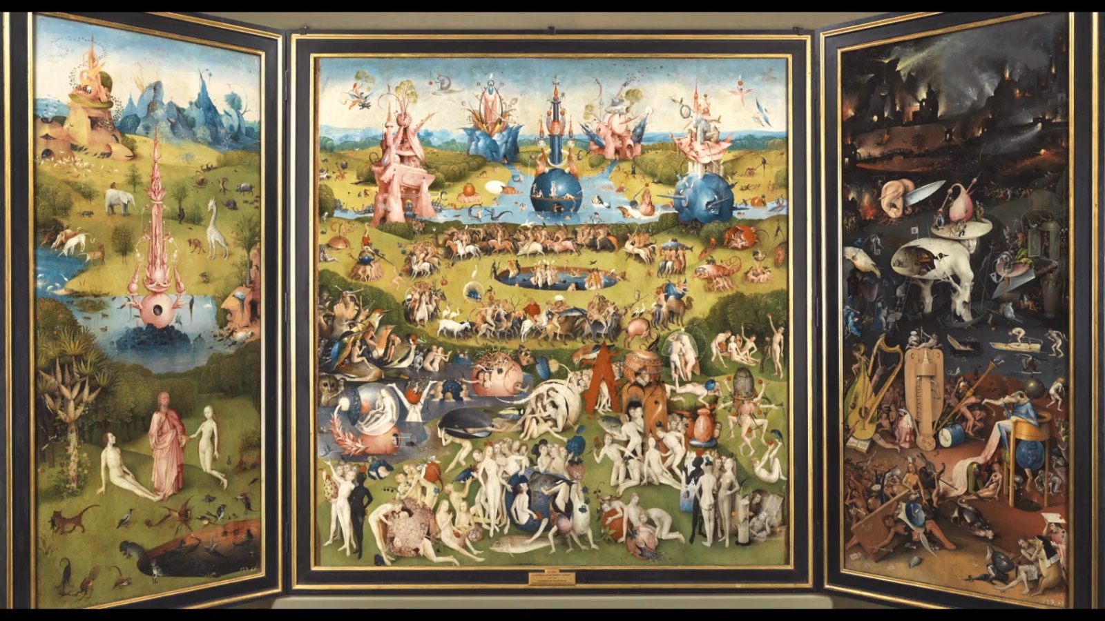自1939年起為西班牙馬德里的普拉多博物館館藏的《人間樂園》,此畫封蓋時外側是創世紀時的景象,既氣派又宏偉。展開後分別由左至右是「伊甸園」、「人間樂園」、「地獄」所組成的三聯畫,遠觀宏觀大氣,細節卻又見微知著。