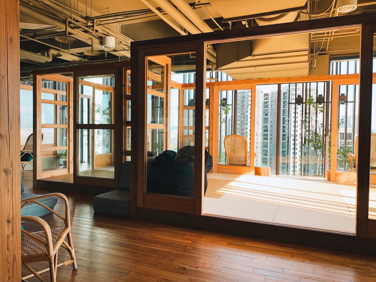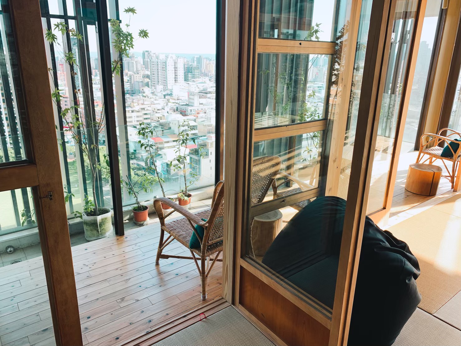 跳脫一般青年旅館擁擠、共用的不適印象,星誠旅店從一進門就是寬敞、綠意盎然且整齊。大廳以木質設計為主,搭配榻榻米及藤椅,溫暖色系包圍了整個環境,也舒緩了每個旅人的心。除此之外,大片落地窗面向勤美綠園道大草坪,台中的街景一覽無遺,讓人壓力頓時減少,只想坐臥在榻榻米上,發呆度過一個下午。到了夜晚,沒有台北密集的燈火壓迫,取而代之的是閃爍的少量燈光與公園無光害的互補,這樣的景觀看起來是和諧與靜謐。
