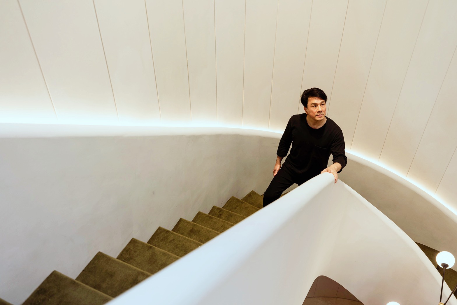 這次「春福賦格」的接待會館同樣由天坊室內計劃操刀設計,來呼應未來公設空間的設計意涵與理念,一踏進會館彷彿走進藝術廊道,一眼望去反而沒有任何銷售道具,而是一座挑空的白色旋轉梯呈現優雅的質感調性,精準計算弧線與曲面,主要希望觀者走進到這個空間裡,去除掉大眾對於傳統接待中心的商業氛圍的感受,反而有種回到家的舒適感,感受靜謐與自在的氛圍。