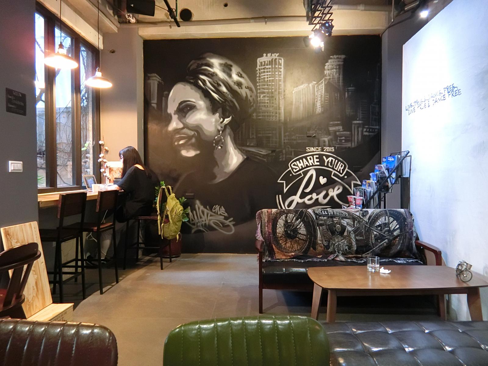 在裝潢設計方面,Nicole自己很有想法,希望營造復古工業風,大量使用鐵件及木頭,也因為自己喜歡舞蹈的關係,也特別加入街舞的元素,店內有個巨幅人像的塗鴉牆面,畫的是美國籍非洲裔黑人Marjory,Marjory是全球街舞文化發展60年來的元老級人物,對街舞圈貢獻很大。Nicole談到,「Majory去年因癌症過世,但她無私奉獻的愛與力量,深深影響著許多人,希望這幅畫能將她的精神永續傳遞下去。」