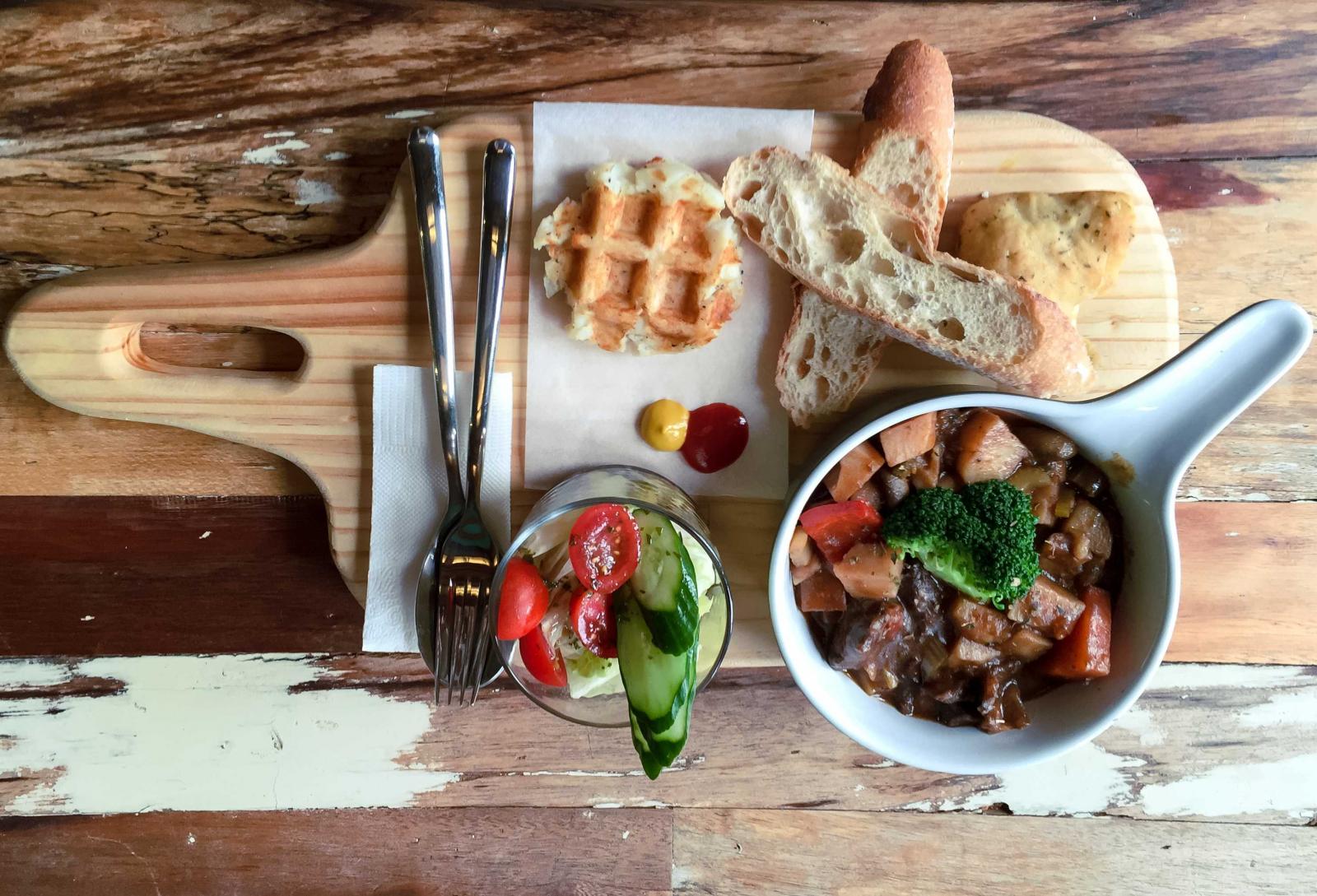 店內推薦餐點紅酒燉牛肉,麵包沾附著微酸甜牛肉湯,搭上清爽的沙拉與鬆餅狀薯餅,是道開胃又有飽足感的選擇。而餐具的部分,湯匙放口袋也使用木製托盤來延續一貫的木質調性。桌上擺著乾燥花小盆栽,為沉穩的工業風格融入了柔和氣息。在「湯匙放口袋」享受完老宅的悠閒時光後,也可以到附近的古城門走走,更能體會恆春古鎮之美。