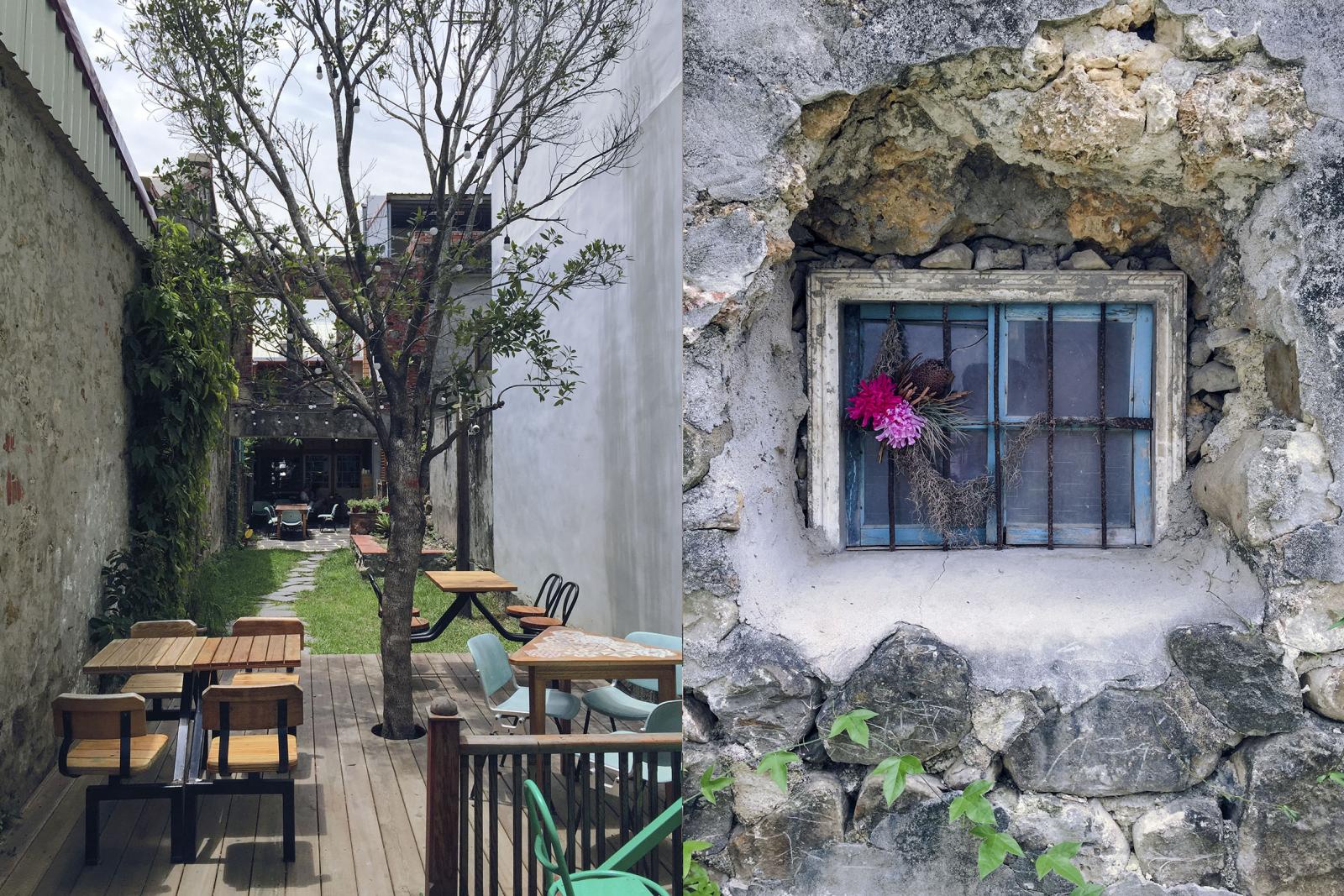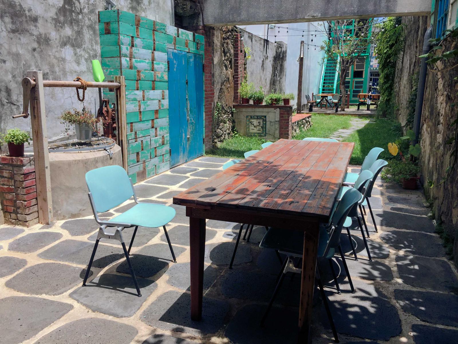 「湯匙放口袋」是由百年老宅所翻修而成,後院內保留了一座古井,雖然目前已經沒水,不過仍可想像舊時代,該戶人家是當地的望族世家,主人後院牆上種了爬牆植物,翠綠的築物爬上斑駁的老牆,賦予了老牆活力的生命力;牆中突然蹦出隔壁人家的窗戶,經過紅花與綠葉的點綴也繪成了一幅清新的畫作。咖啡館二樓仍然有一大部分是室外空間,在二樓的室外空間可眺望周圍老宅面貌,感受破舊磚瓦帶來的復古情懷,天氣好的時候也可以盡情享受藍天白雲,做個日光浴十分享受!