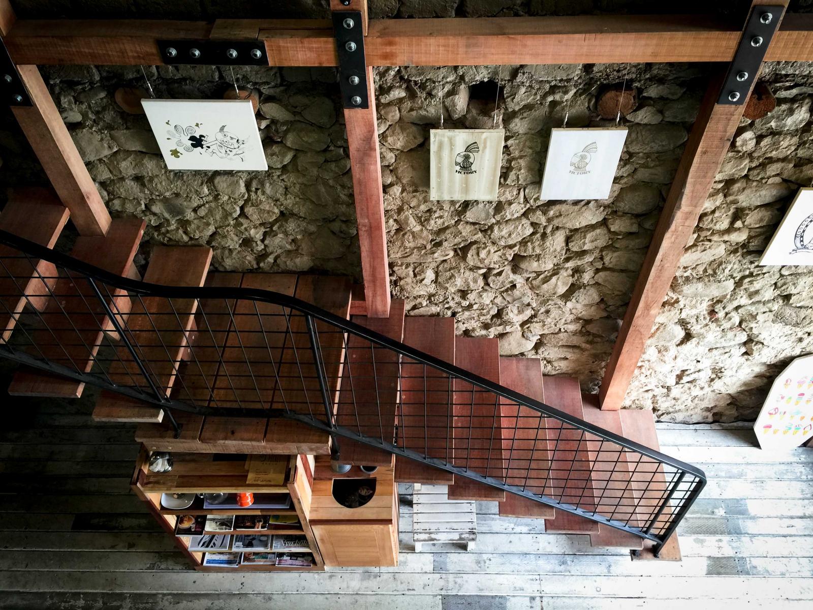 在歷史悠久的恆春古城西門附近,同樣擁有百年歷史的老宅,在「湯匙放口袋」的老闆手上綻放出年輕活力。推開大門,映入眼簾的是開闊的樓中樓設計,進門後目光很容易就被連接一二樓的木梯所吸引,沿著木梯往上看,一整面磚牆輔以厚實木材的樑柱,帶出十足的工業風與復古味。儘管空間配色大多都是深色系的,不過門面整片落地窗的設計讓「湯匙放口袋」的採光很明亮,呈現寬闊的格局。