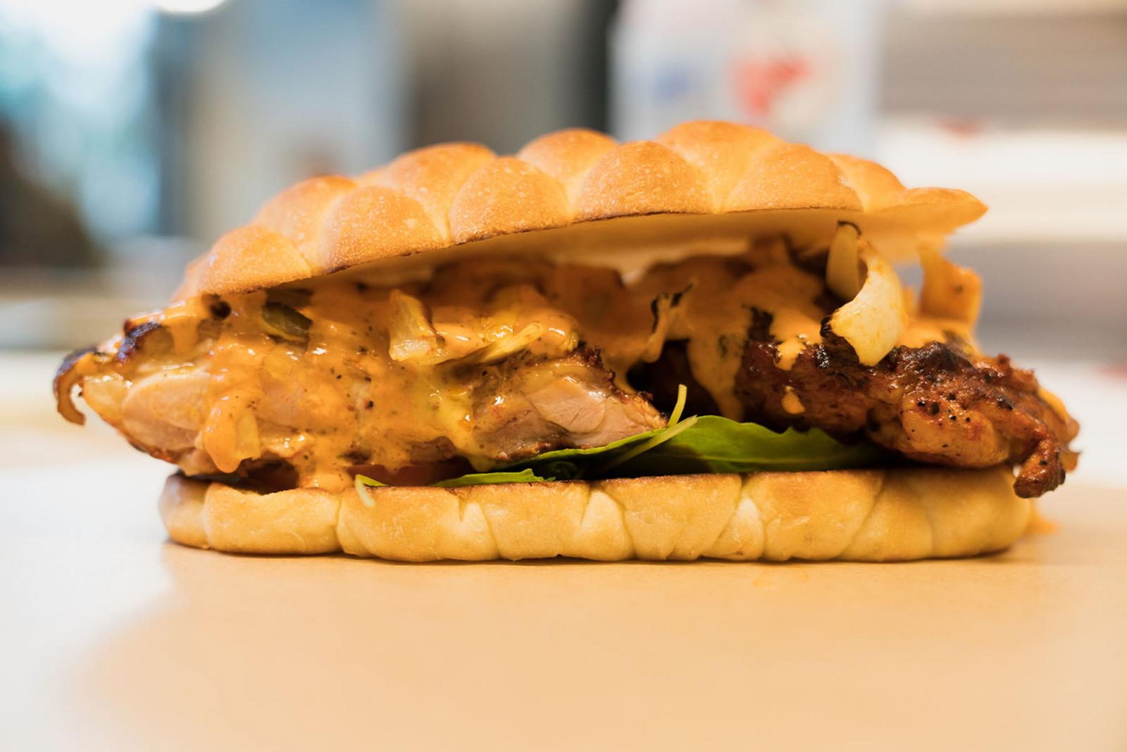 「墨西哥牛肉堡」以Prime高等級熟成牛肉製作,正反微煎至五分熟後鋪上切達起司,搭配自製麵包、芝麻葉、番茄以及特製墨西哥辣椒,大口吃下去噴出鮮甜肉汁,牛肉份量十足,店內必點餐點之一。「焦糖洋蔥豬肉堡」豬肉使用店內獨有技術油網包覆,油網形成保護膜鎖住豬肉肉汁,使得口感豐富多汁不乾澀,搭配店家自製焦糖洋蔥,產生鹹甜交錯的好滋味,豬肉超厚實,老闆給料真的沒在客氣的!