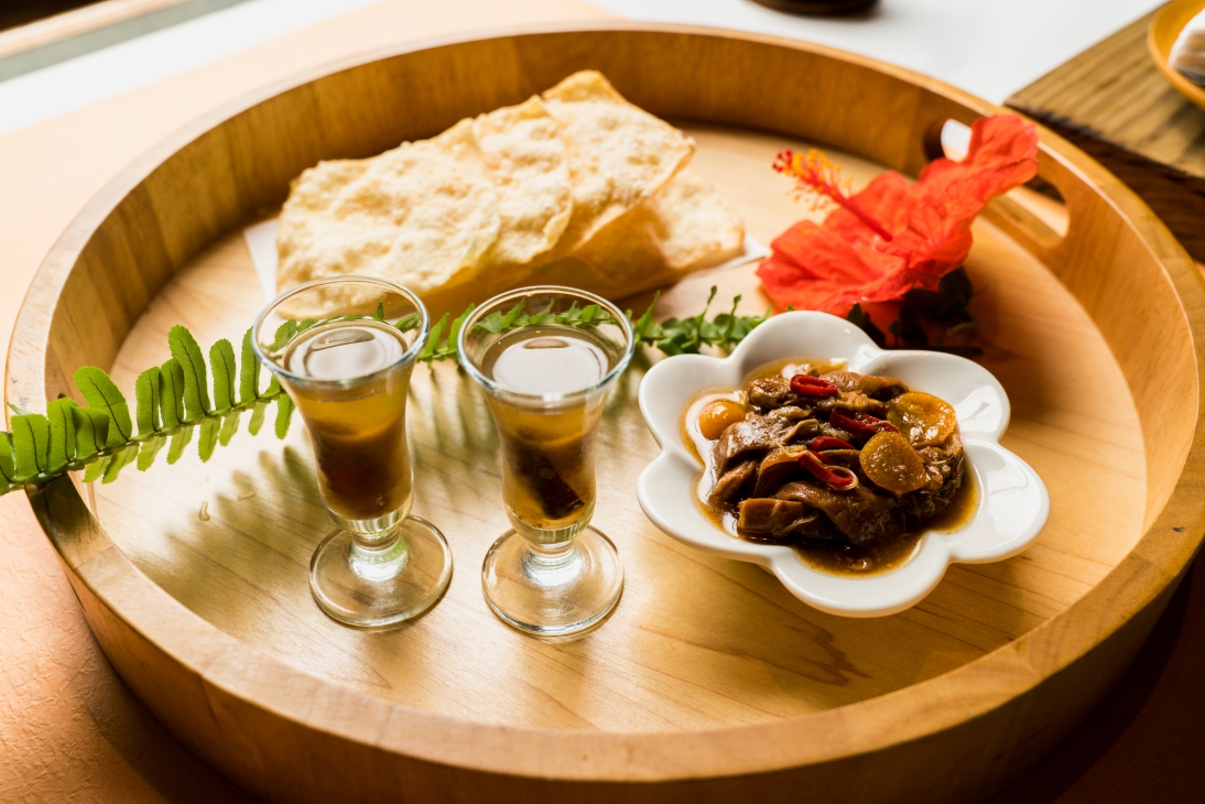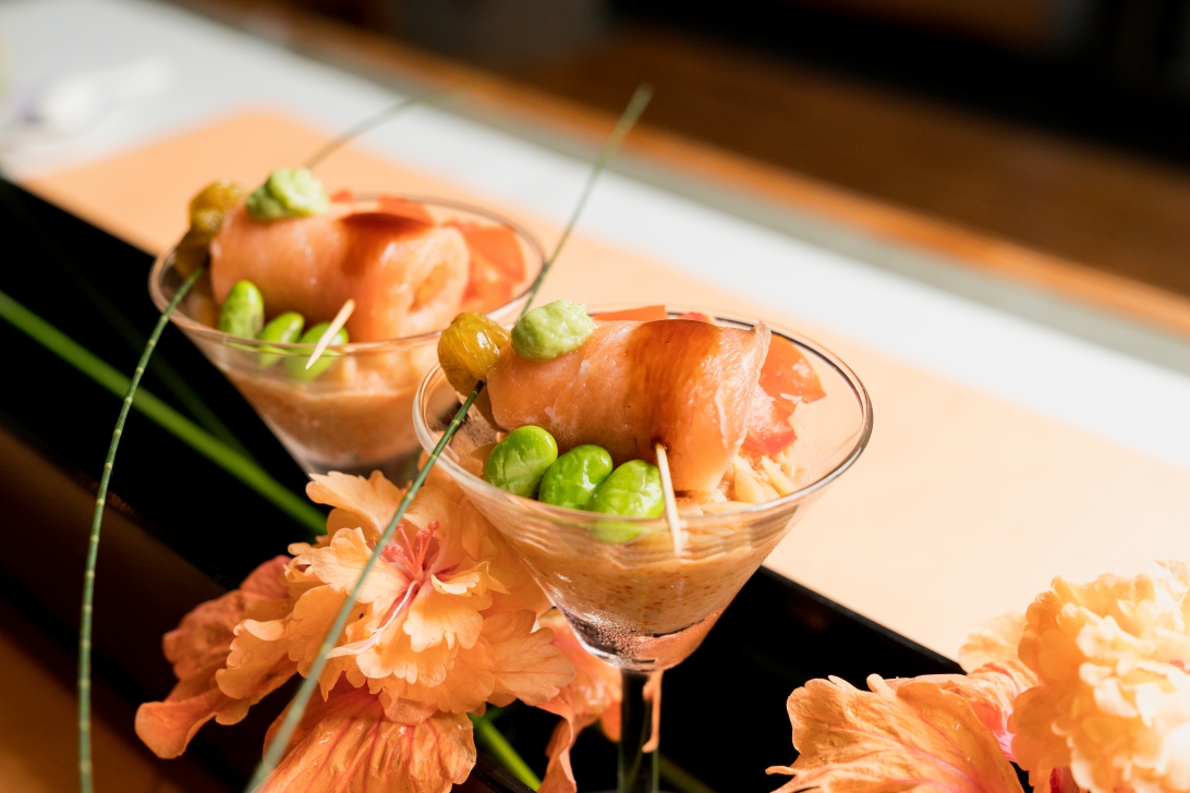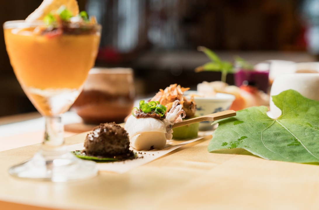 店內14道料理當中,先以東方美人茶作為開始、再以擂茶結尾。其中包括幾道特色創意料理,從最初登場亮相的系列菜餚中,光擺盤就很吸睛,更別說口味更是令人相當驚豔。像是不做任何調味的紅龍果汁,藉由櫻花鹽將甜味提出,搭配養生食材奇亞籽幫助消化,還有野鳥來播種的刺衝沙拉,搭配甜蝦、黑豆等,更有鮭魚卵、燻鮭魚搭配蘋果、熱黑芝麻醬配蘆薈、奇異果配鱈魚肝、軟柿做成濃汁,搭配干貝醬以及日本小米果,「在這裡,所有東西你一定吃過,但沒有過這樣子的吃法。」彭美容談到。