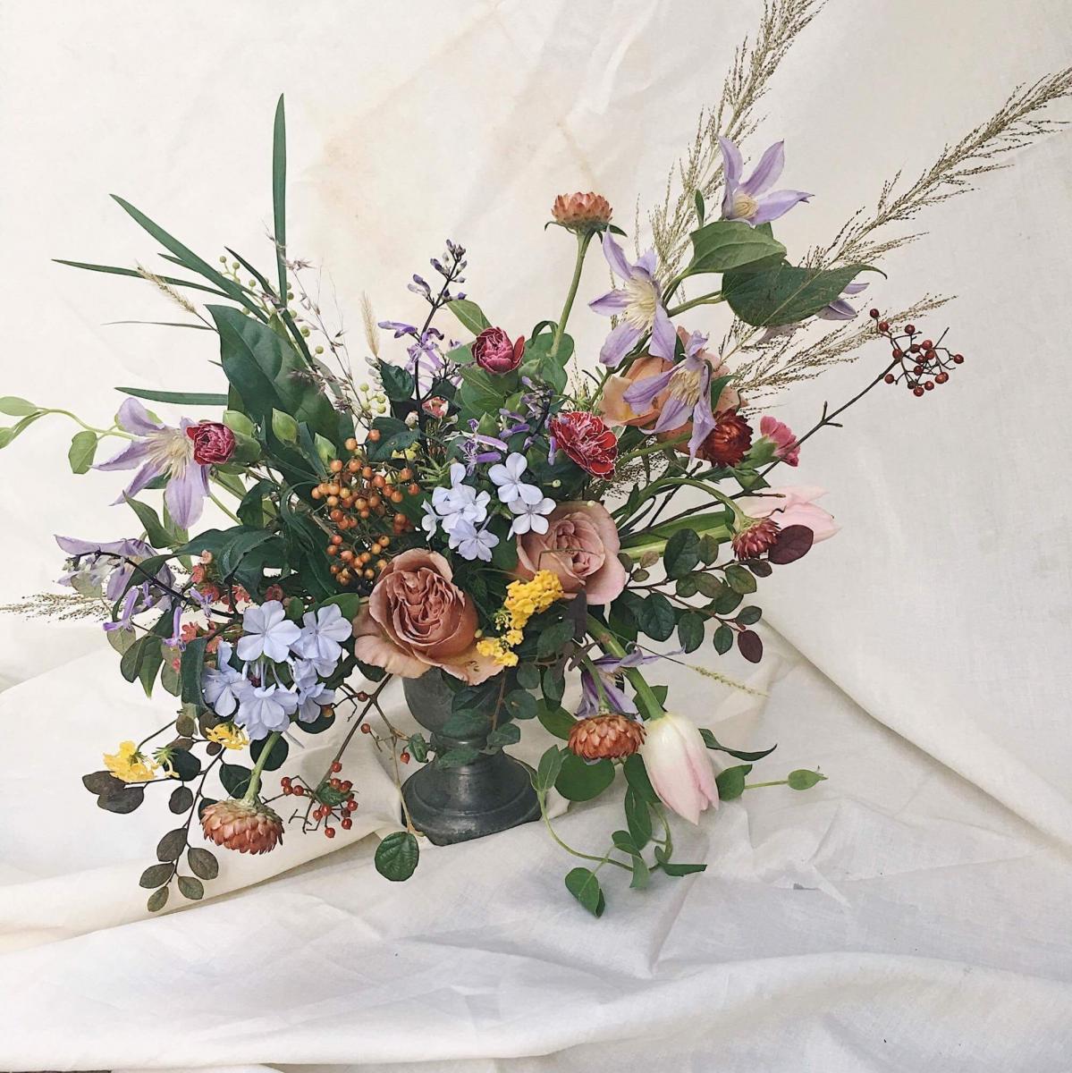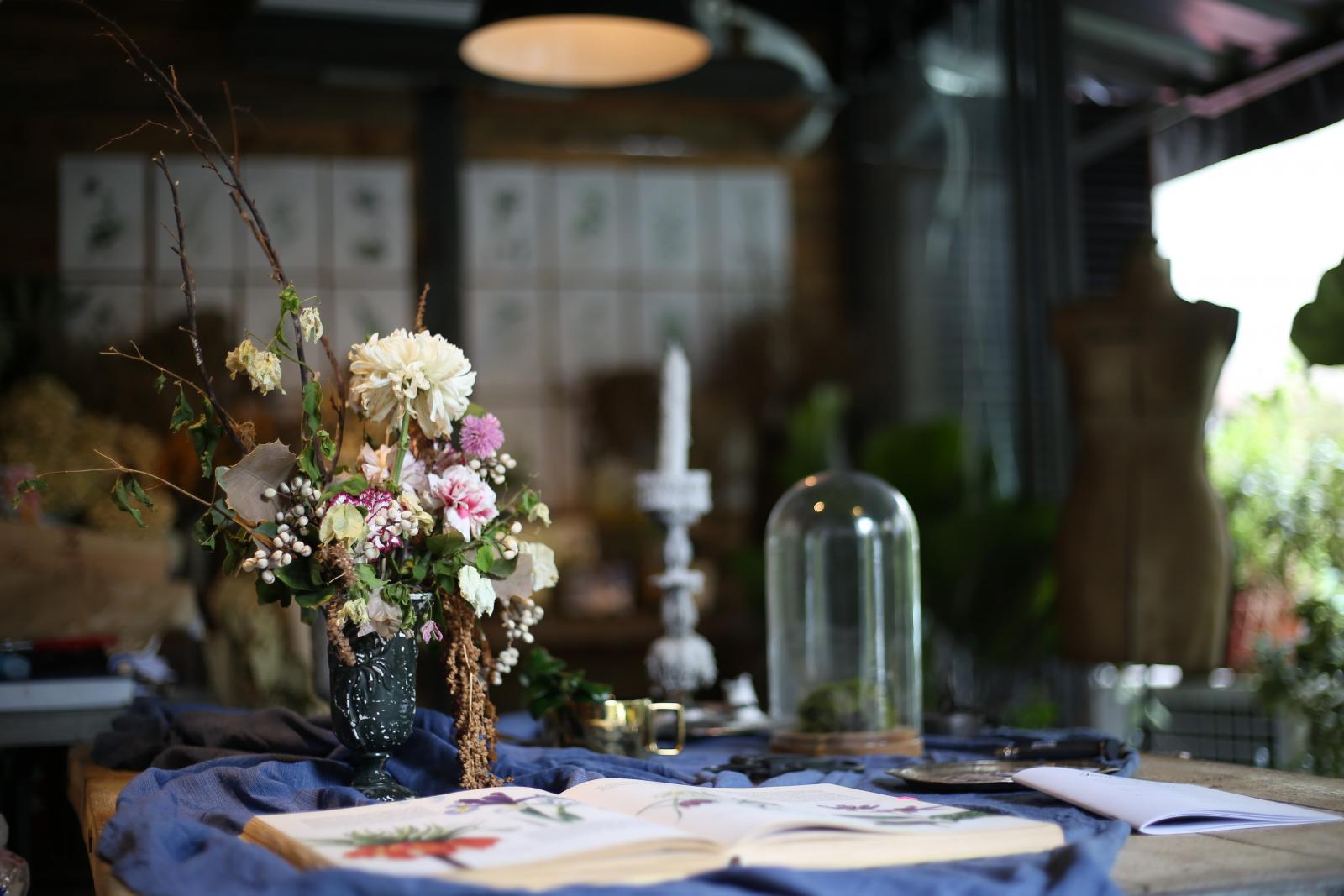 這次,遠赴巴黎的Yen帶著滿滿的藝術能量,進駐由導演錢人豪所經營的咖啡廳「Truffles Living 舒服生活」打造出宛如城市綠洲的花藝工作室,將法國帶有浪漫且恣意生活的氛圍帶進台灣,陳舊的金屬花器搭配庭園玫瑰,大面落地窗陽光灑落在舊書籍及舊報紙中,感受到秋天裡令人幸福的溫度。