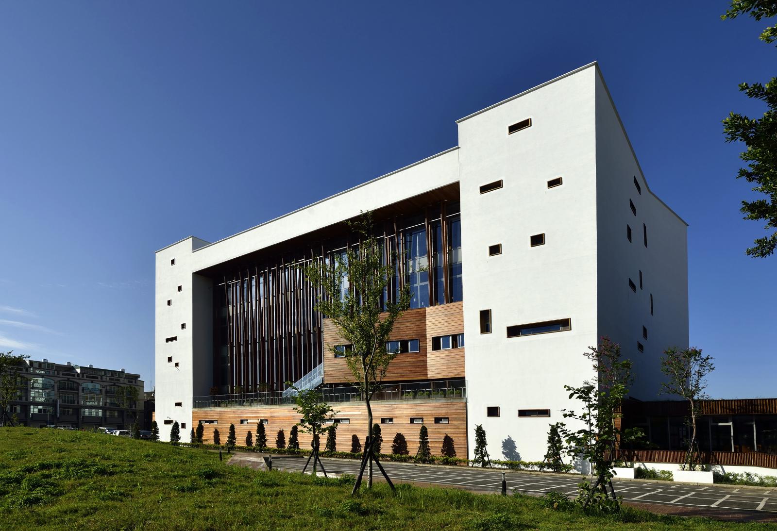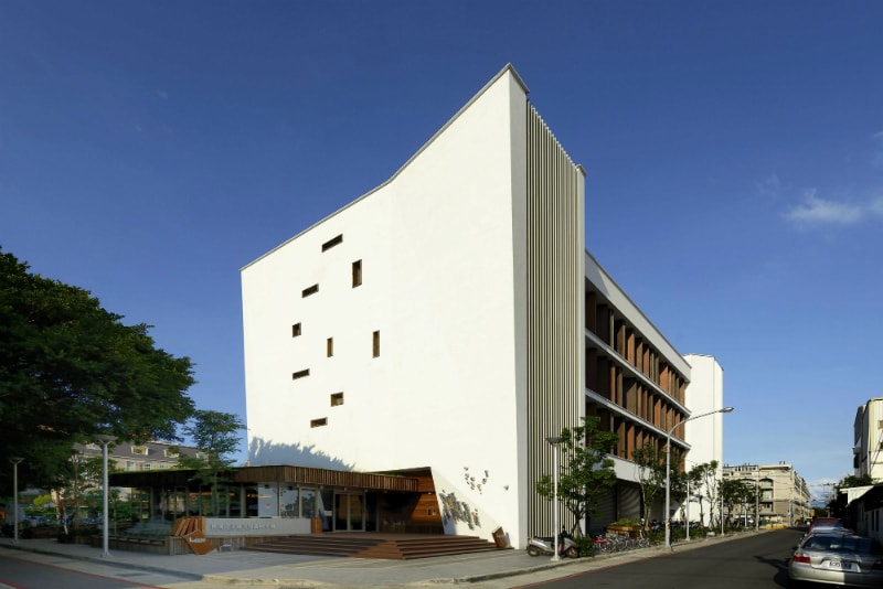 建築外觀以半具象、半抽象的方式詮釋,並對應周邊環境特性,依照座向打造許多細膩的設計,在東西向以堅實量體,減少開口面來避免西曬問題,更象徵一本即將被翻開的巨書,而表面上的小開口則代表著前人翻閱後所留下的痕跡。