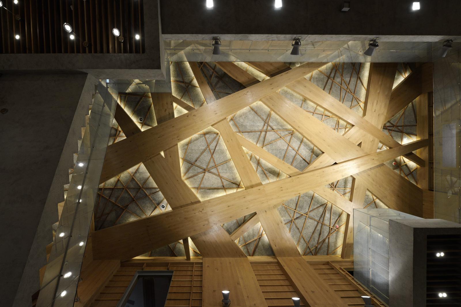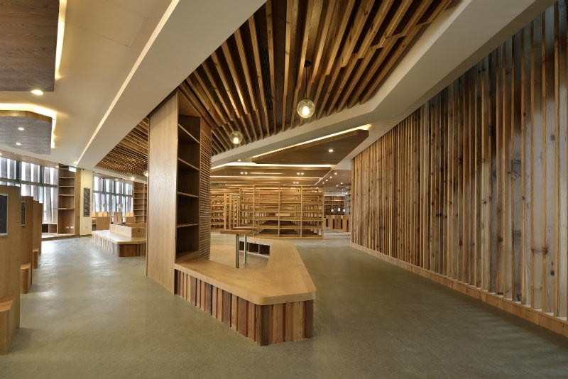 南向開大窗搭配外覆花旗松集成材的鋁質線條板,讓自然及光線引入室內,設計概念由45本大書組成,每本書樓高達1層,除了美觀之餘,更具備過濾系統功能,阻絕日曬、噪音及外在雜亂視野,讓民眾靠在窗邊看書時,同時看到美麗的木紋身影。