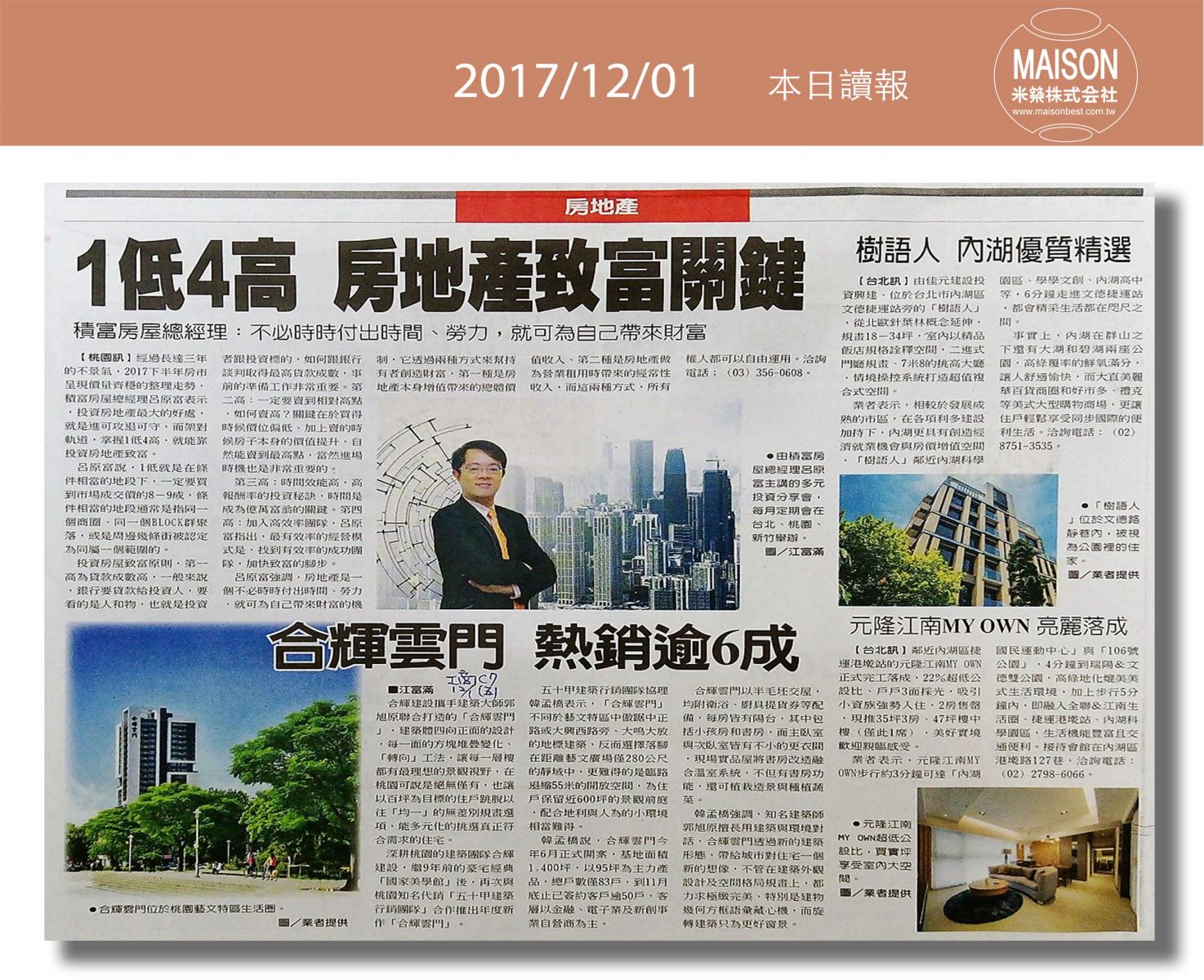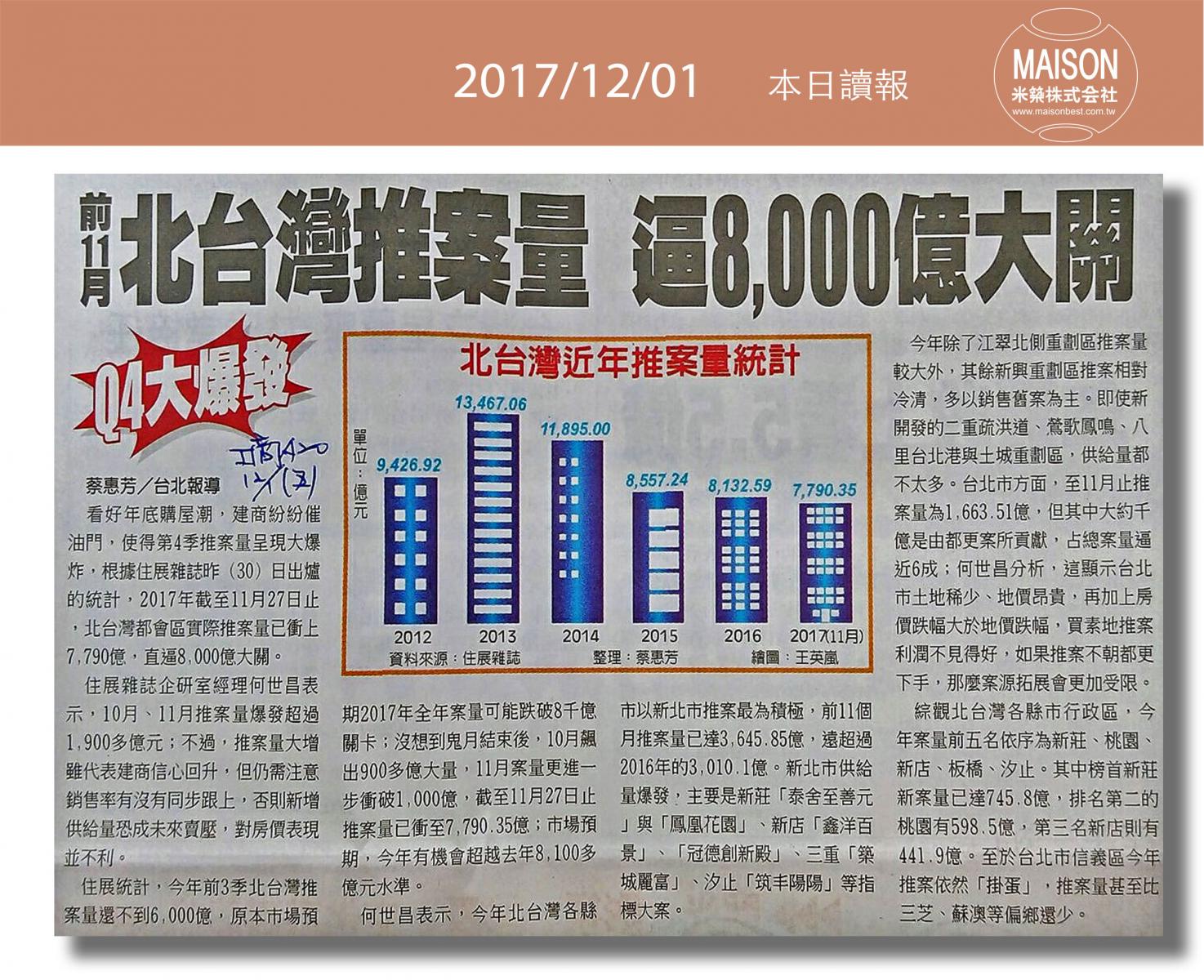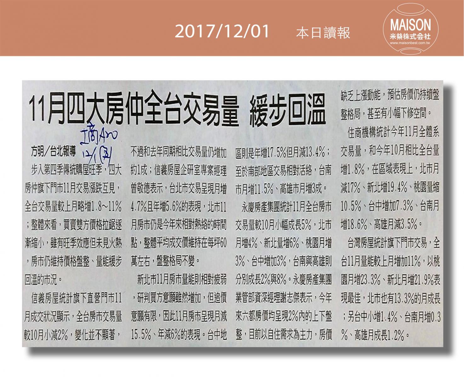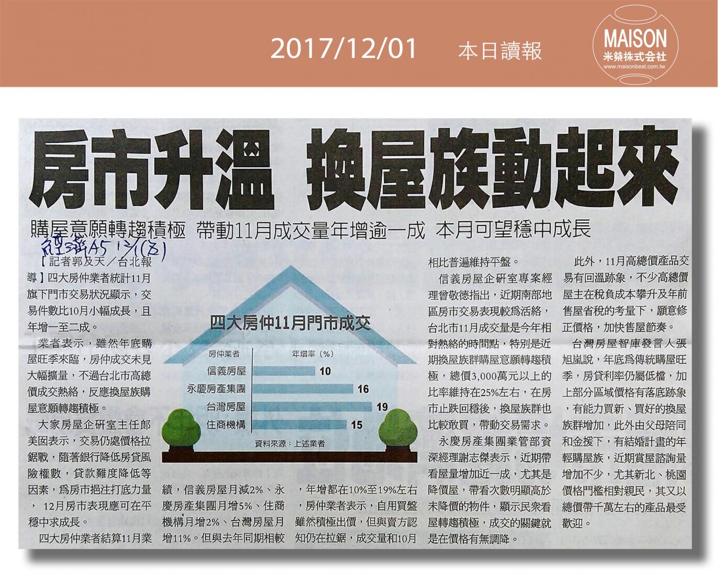 今日讀報(12/01)!1分鐘掌握財經房態今日新聞重點:房市升溫 換屋族動起來:前11月北台灣推案量 逼8,000億大關:11月四大房仲全台交易量 緩步回溫:1低4高 房地產致富關鍵:中部灰濛濛 房空汙宅會呼吸:………