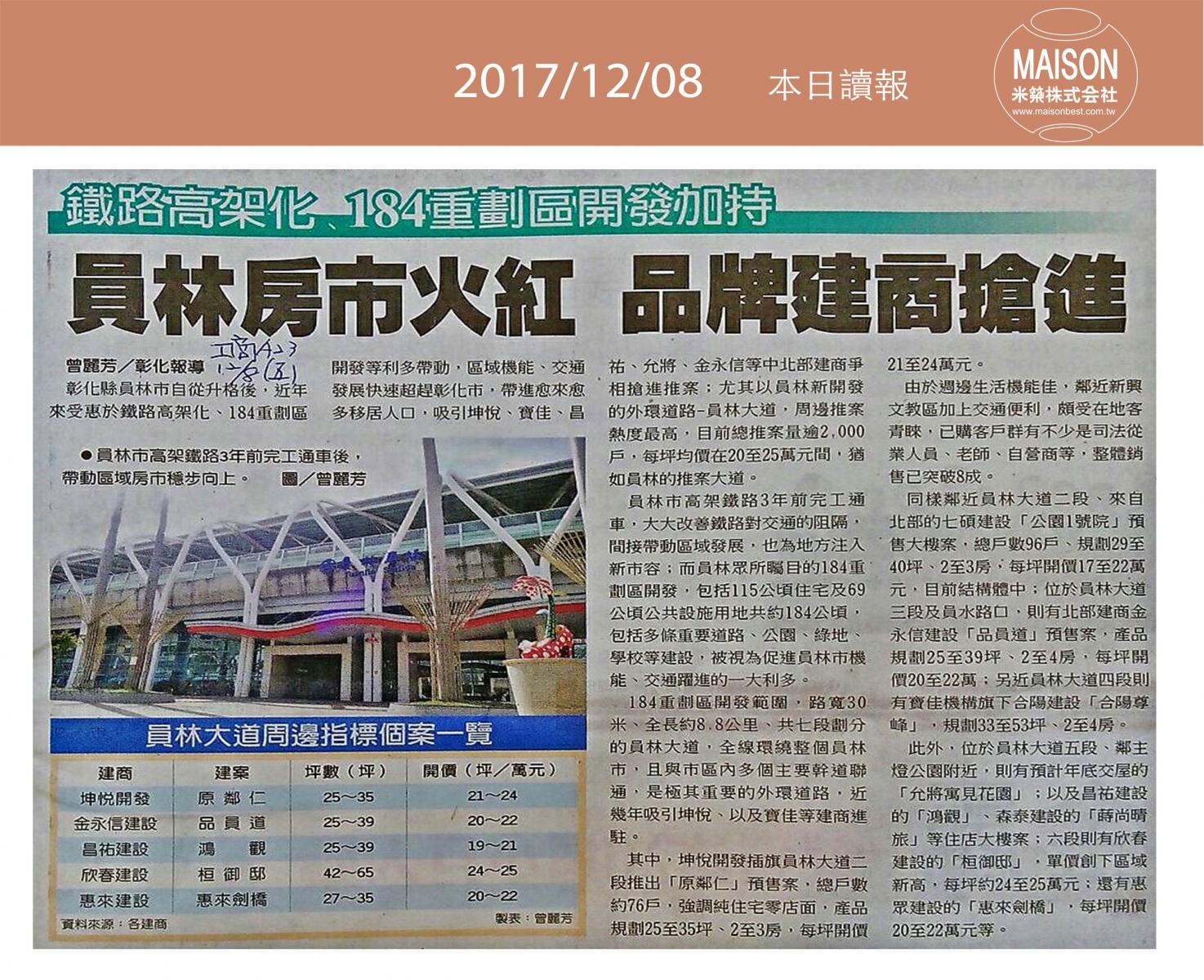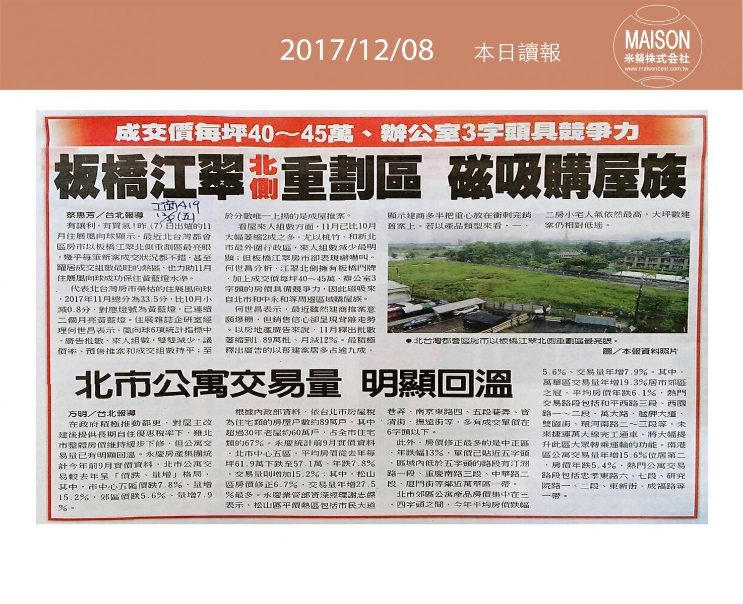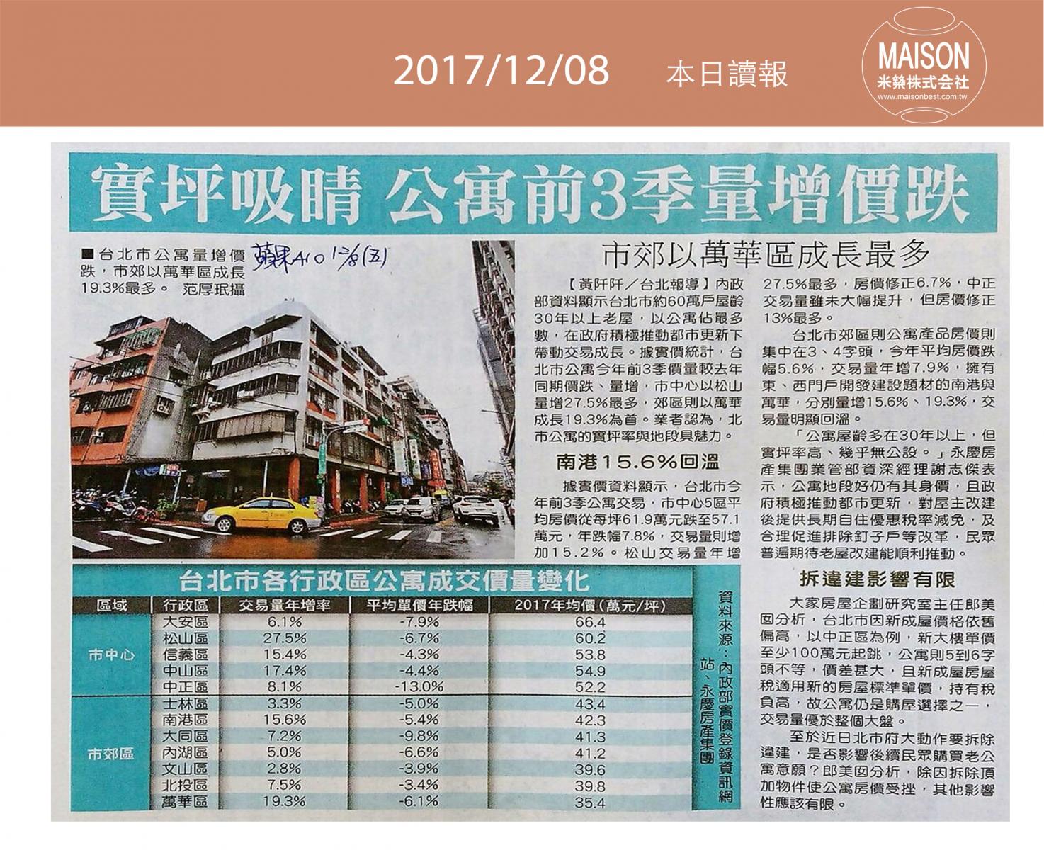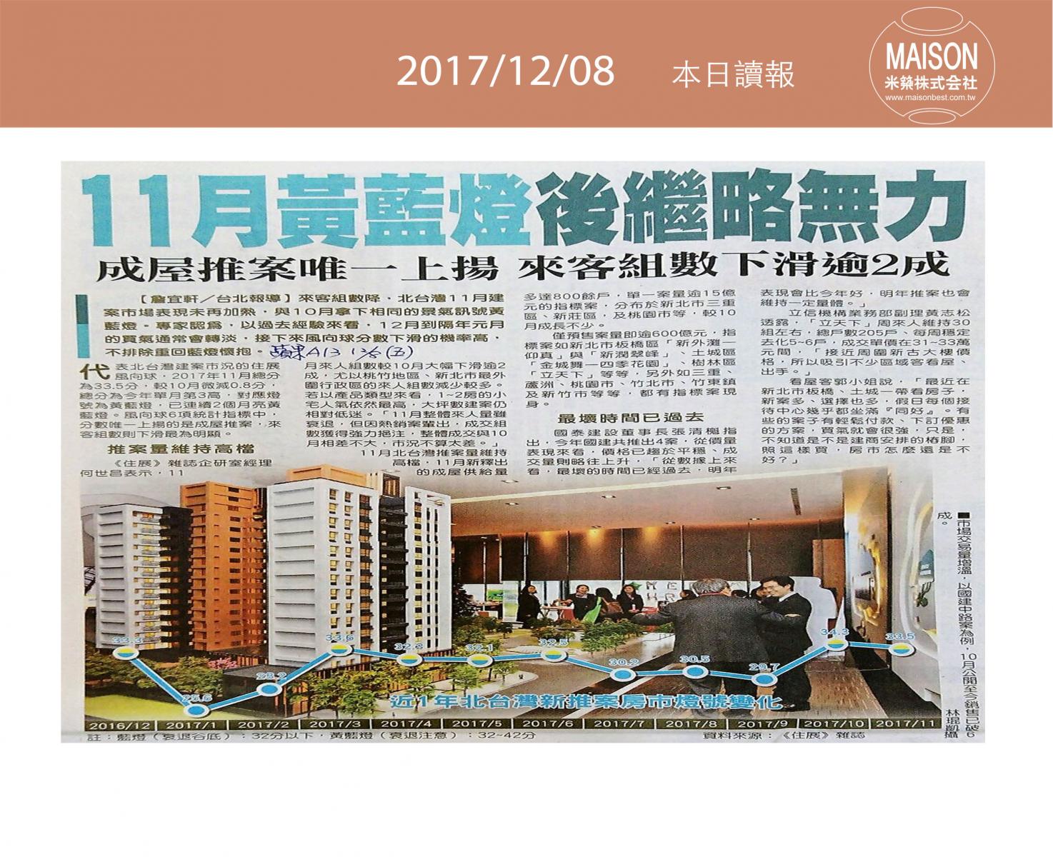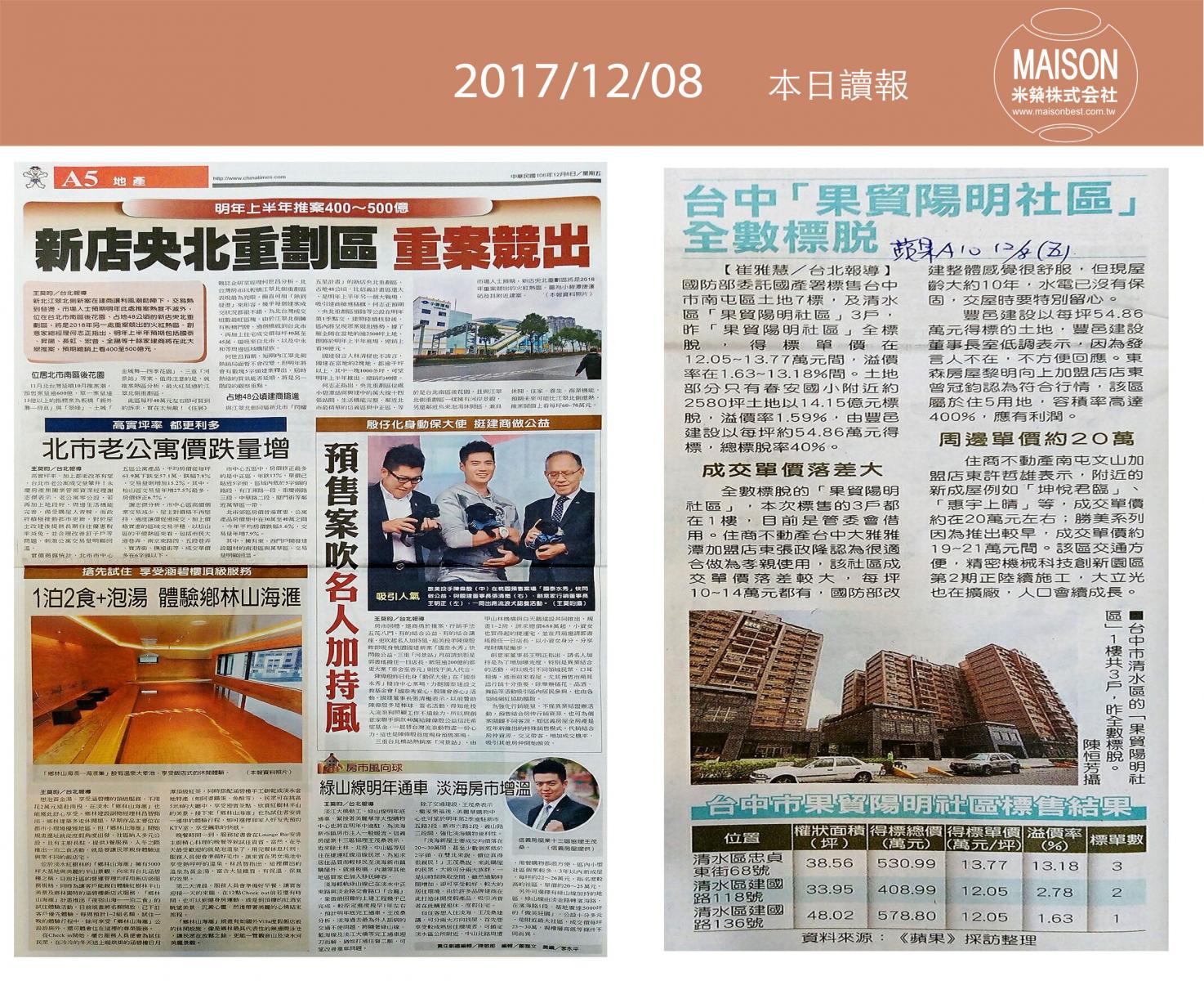 今日讀報(12/08)!1分鐘掌握財經房態今日新聞重點:實坪吸睛 公寓前三季量增價跌:員林房市火紅 品牌建商搶進:新店央北重劃區 重案競出 :11月黃藍燈後繼略無力 ………