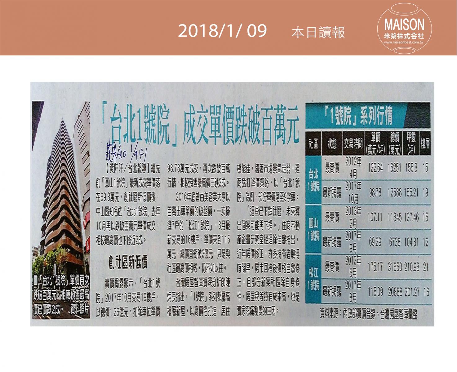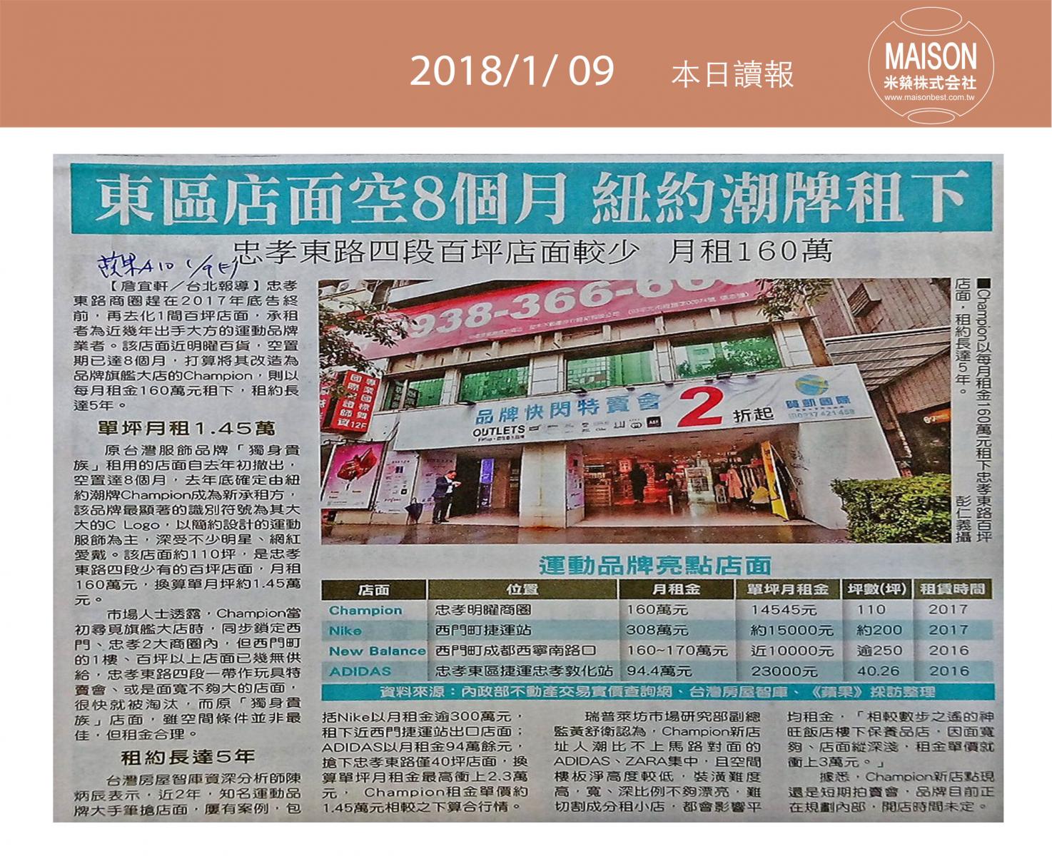 今日讀報(1/09)!1分鐘掌握財經房態今日新聞重點:東區店面空8個月 紐約潮牌租下:華友聯 2017年營收 年增7成:「台北1號」成交單價破百萬元 ………