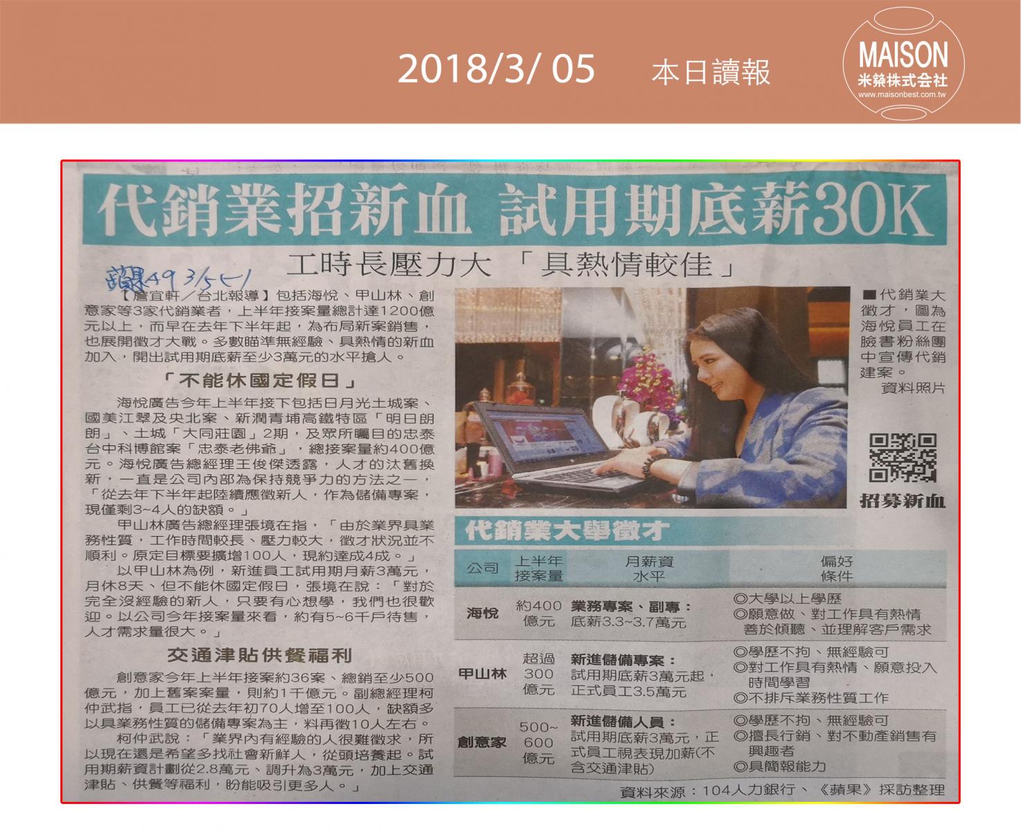 今日新聞重點:代銷業招心血 試用期底薪30K:機捷A7佔推案 寶嘉戰遠雄:頭前溪河濱公園建棒球場 月中動工:推案信心升 建商82億購地!