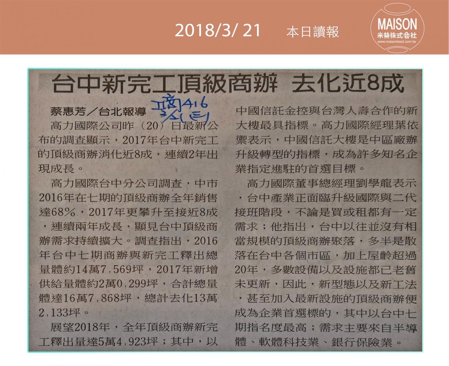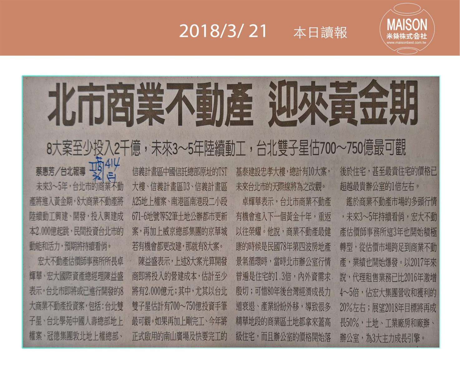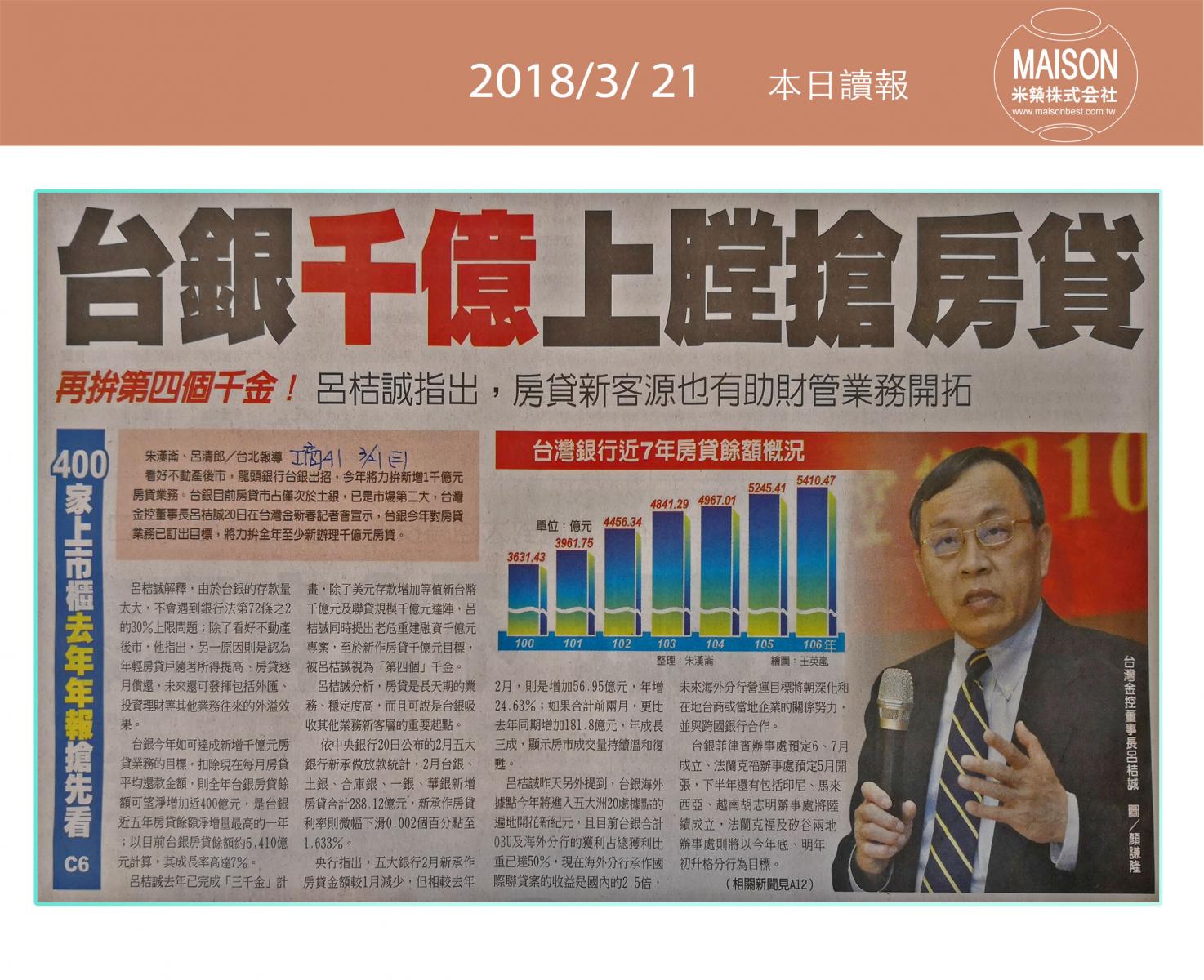 今日讀報(3/21) 1分鐘掌握財經房態今日新聞重點:台銀千億上膛搶房貸:北市商業不動產 迎來黃金期:台中新完工頂級商辦 去化近8成:高雄吹小宅風 2~3房戶數佔比衝8成:西門町店面失速走跌………