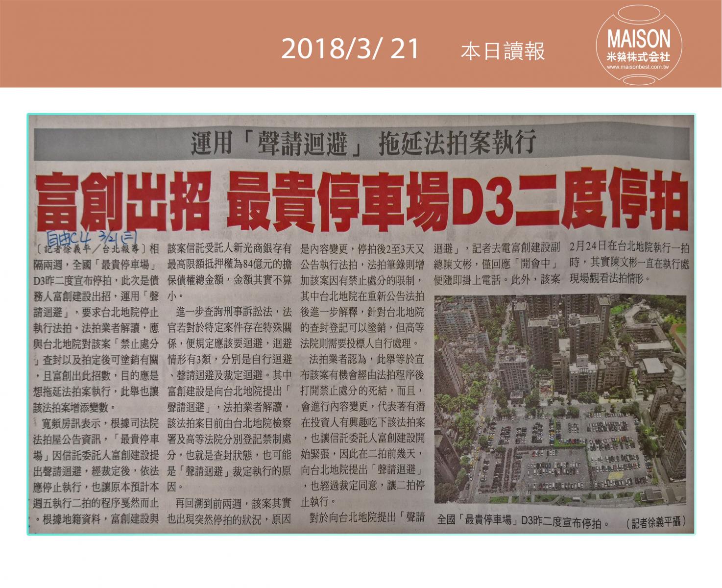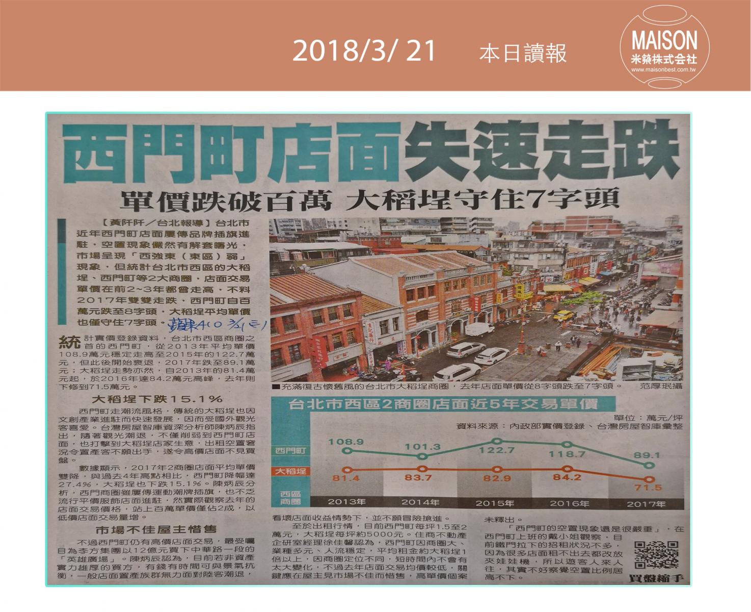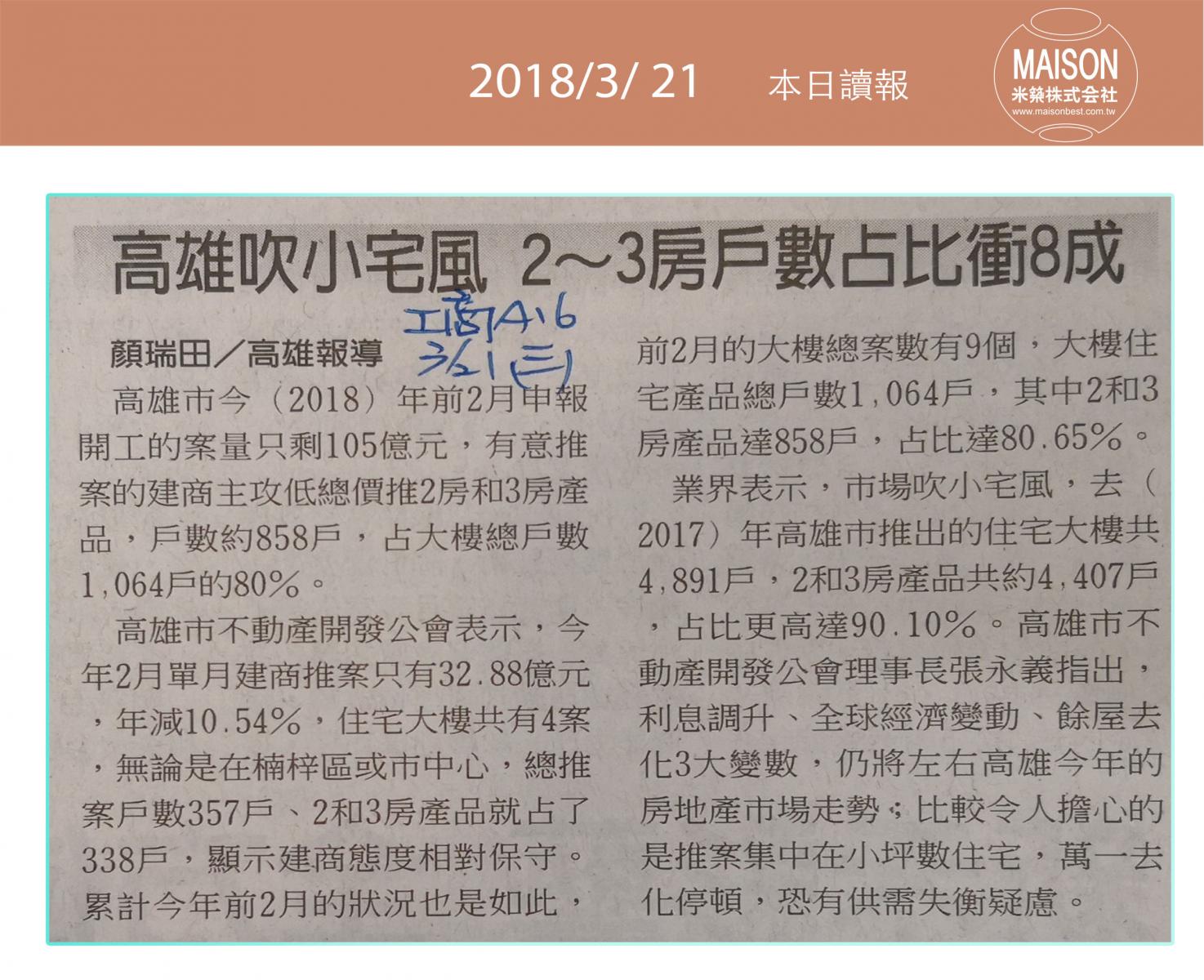 今日讀報(3/21) 1分鐘掌握財經房態今日新聞重點:台銀千億上膛搶房貸:北市商業不動產 迎來黃金期:台中新完工頂級商辦 去化近8成:高雄吹小宅風 2~3房戶數佔比衝8成:西門町店面失速走跌………