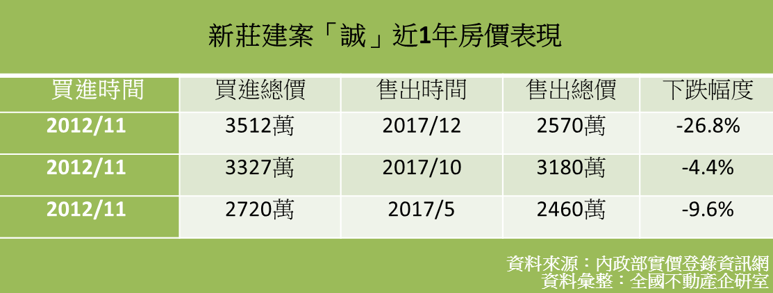 根據實價資料揭露,位於新莊頭前重劃區建案「誠」,去年12月成交頂樓一戶,2012年時以3512萬買進,近期以2570萬出售,拆算車位後單價約32.4萬(以車位180萬/個計算),認賠942萬元出場,房價下跌26.8%,等同持有5年賠售近千萬!