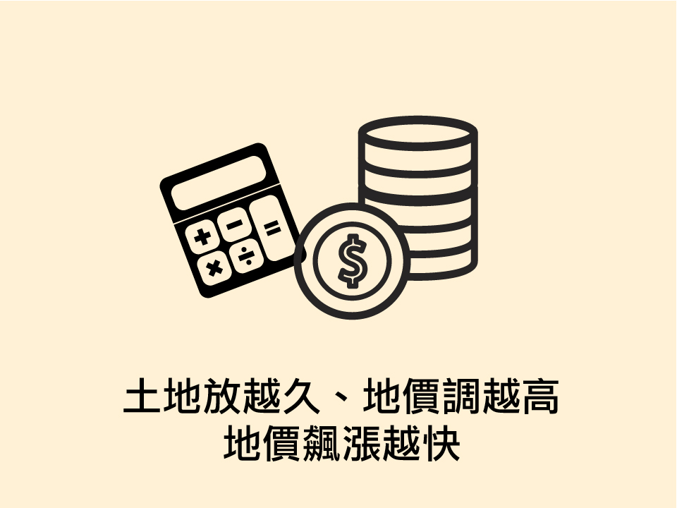 首先土地買賣成本大增,放越久的土地增值稅更嚇人,甚至佔據交易地價的10%-20%都是稅金,當然地主也不會傻傻的讓自己吃虧,這些增幅全部由買方(多數是建商)吸收,而建案興建需要時間,在這過程中一年一年的經過,也代表著這中間所有稅金與公告地價調漲也都在建案的售價中,最終還是購屋者吸收。