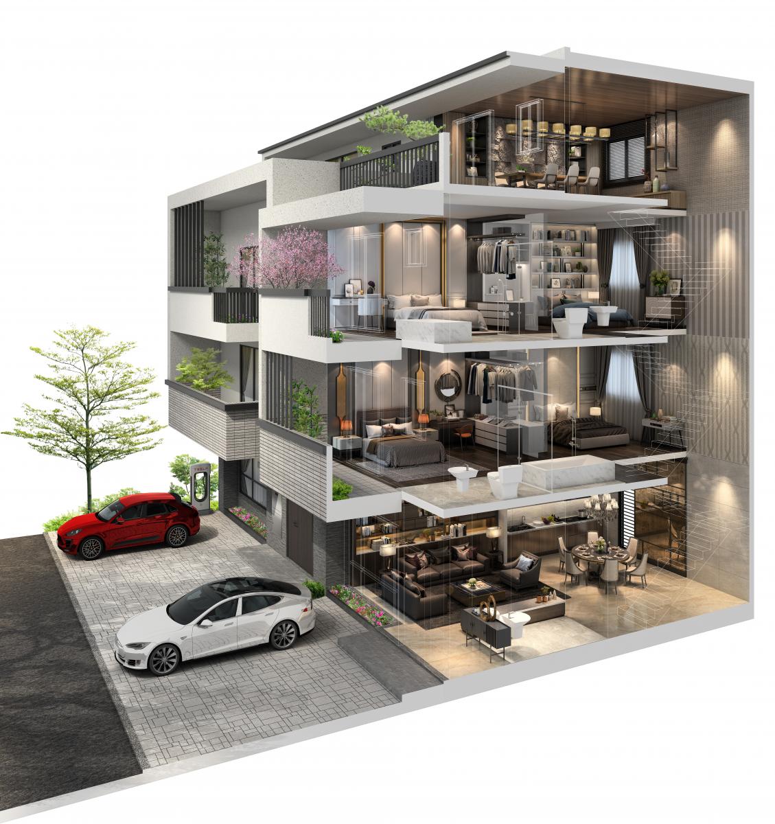 舒壓最需要的就是「空間」,「森Villa」住戶住的是有天有地、全實坪的透天別墅,獨棟雙併的格局不怕鄰居噪音,泡茶、運動、曬衣都可以;坪數40~70坪3~4房,足夠的房間數,家中每個成員都有自己的小天地,如果在疫情期間需要在家工作,也有足夠安靜的空間能夠辦公、不必擔心吵到彼此。建材配備為林內三機,美標衛浴等。