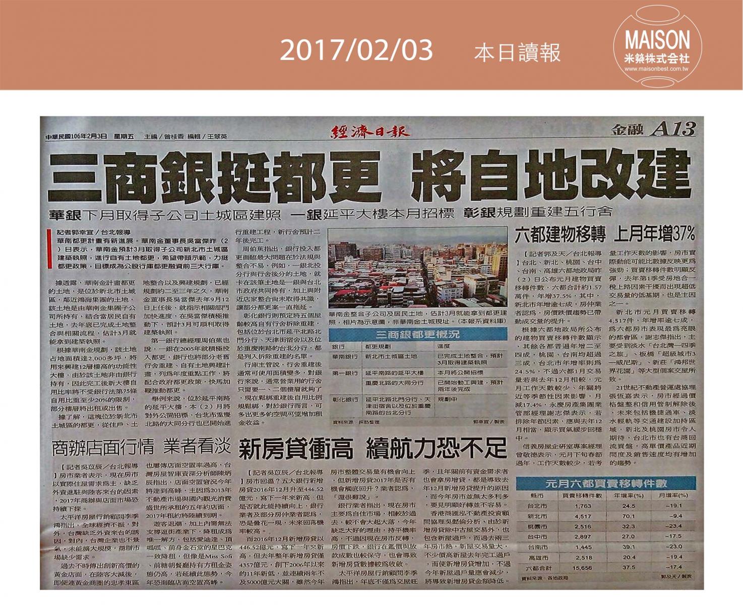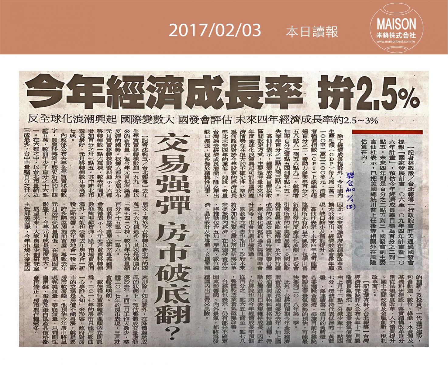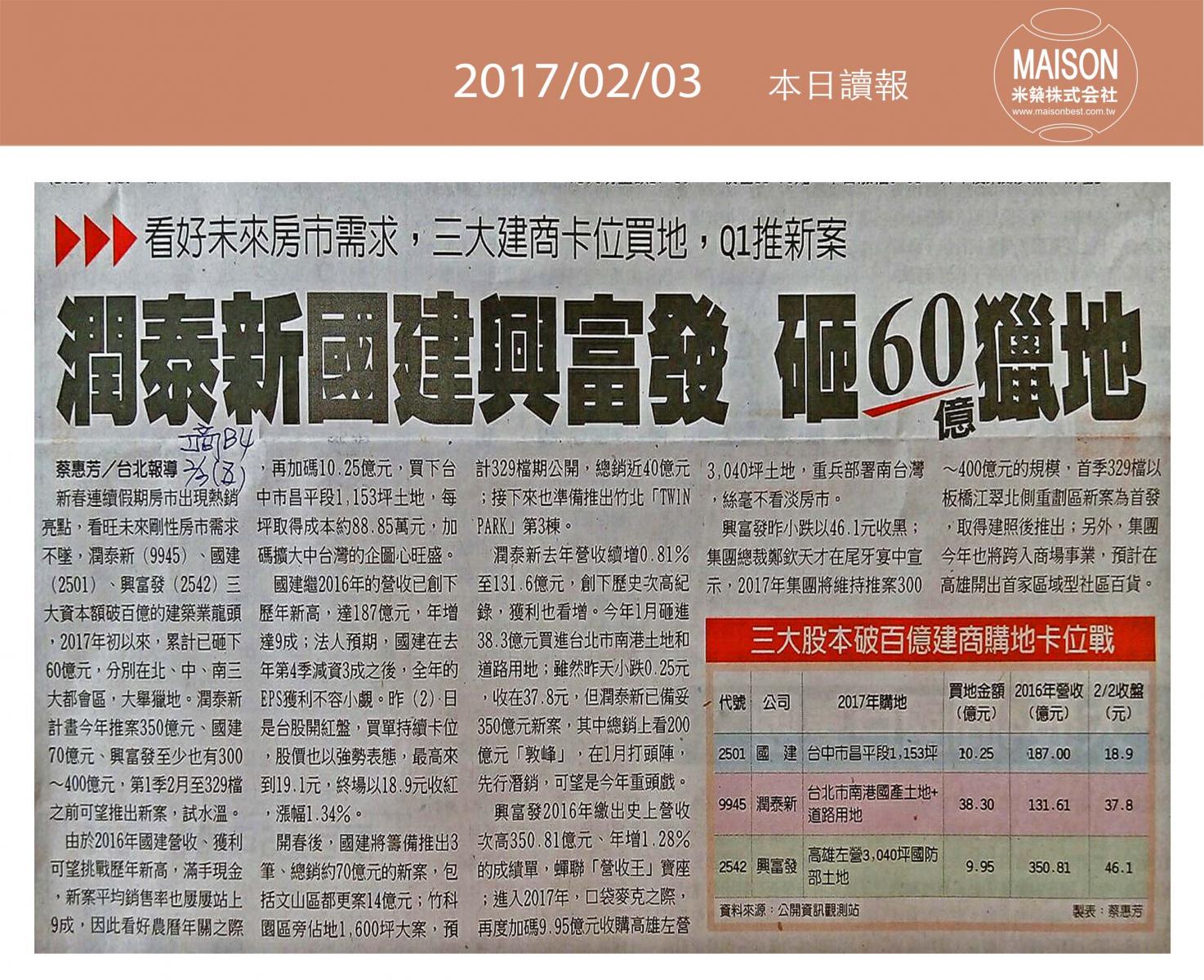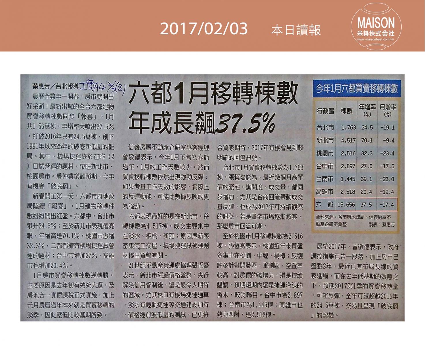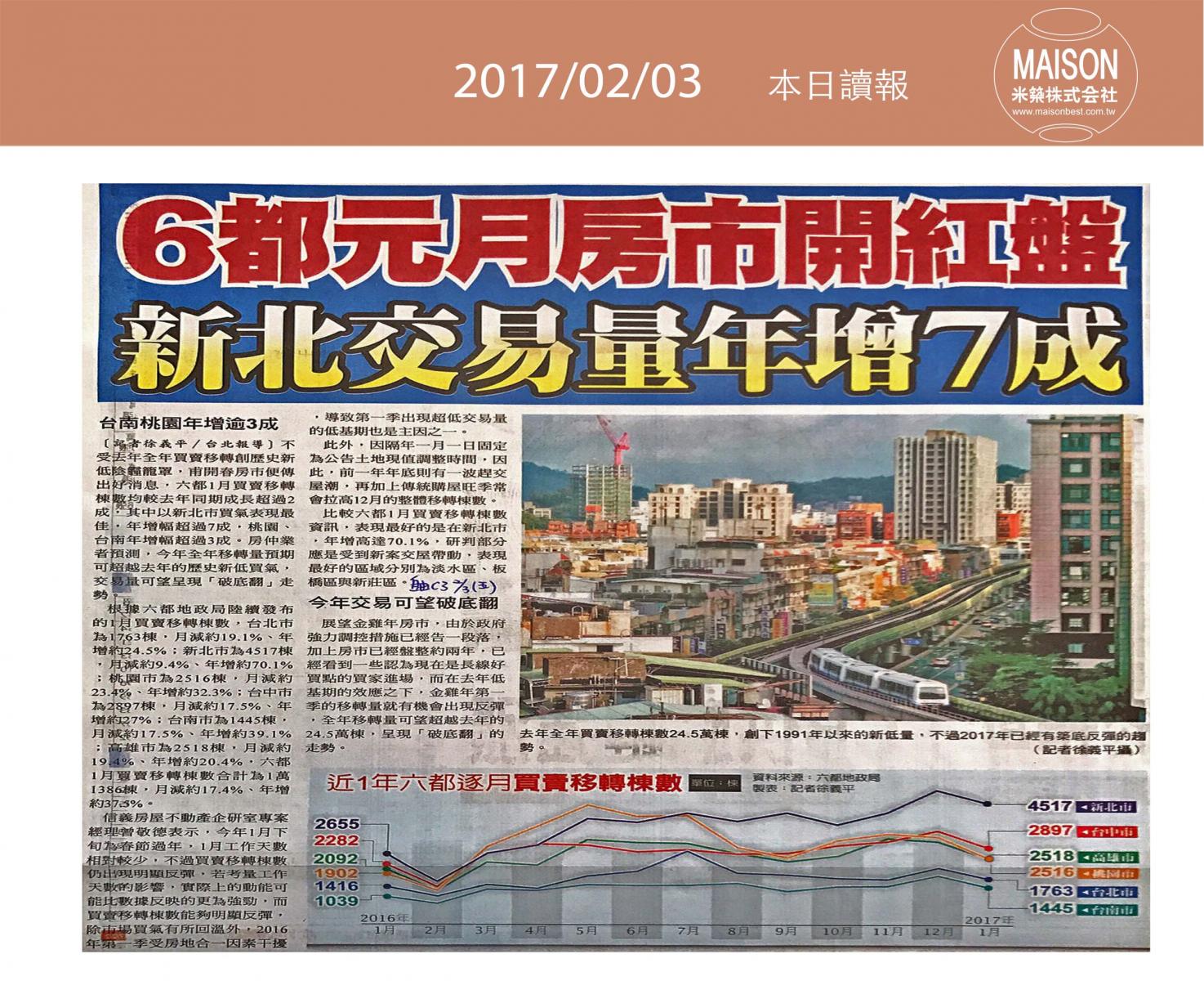 今日新聞重點:6都元月房市開紅盤 新北交易量年增7成;地價稅查清 盯自用宅出租;今年經濟成長率 拼2.5%;潤泰新國建興富發 砸60億獵地;央行放手 台幣升向31;六都一月移轉棟數年成長飆37.5%;中資亨得利 再砸 4.8億掃店面!