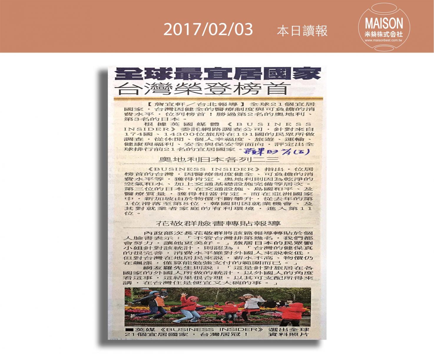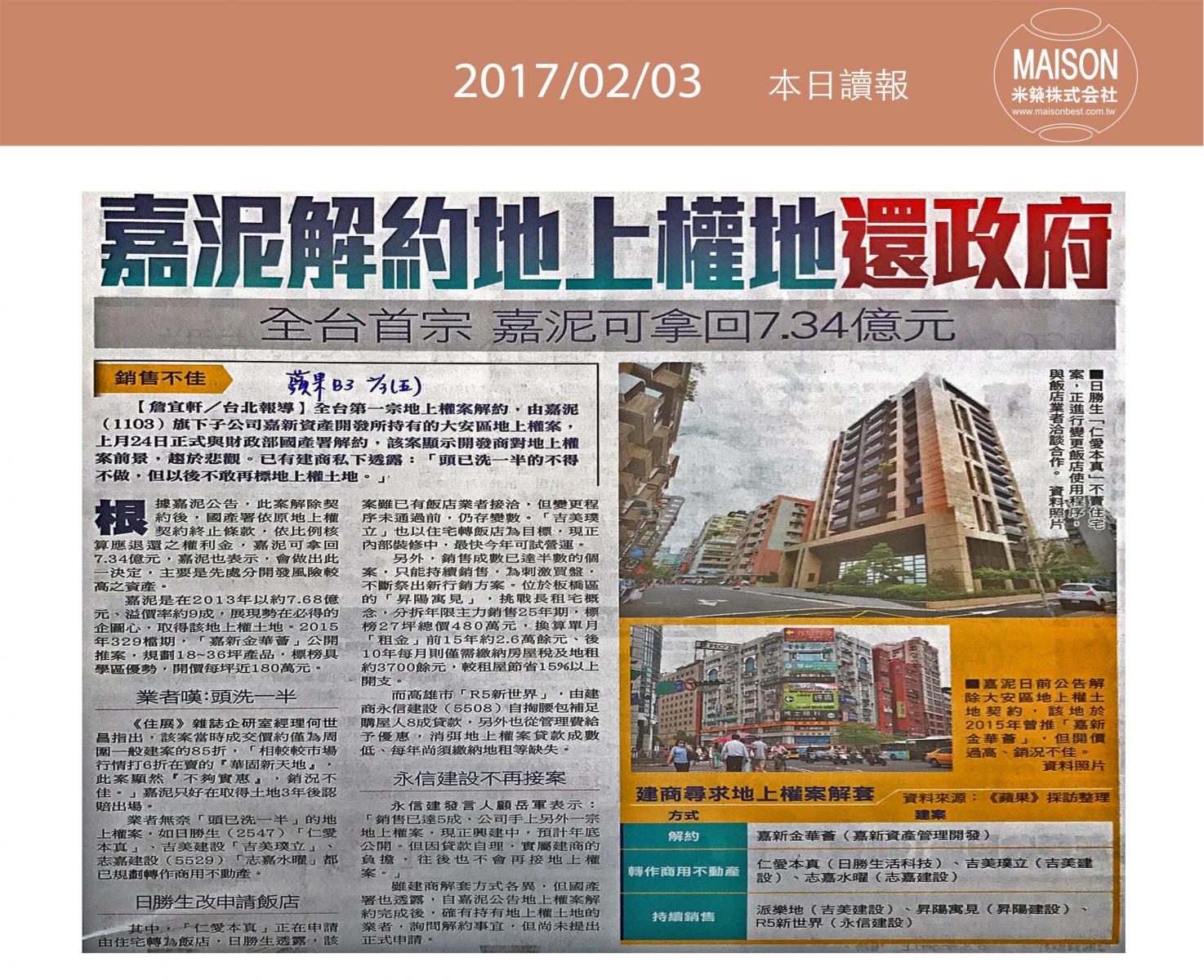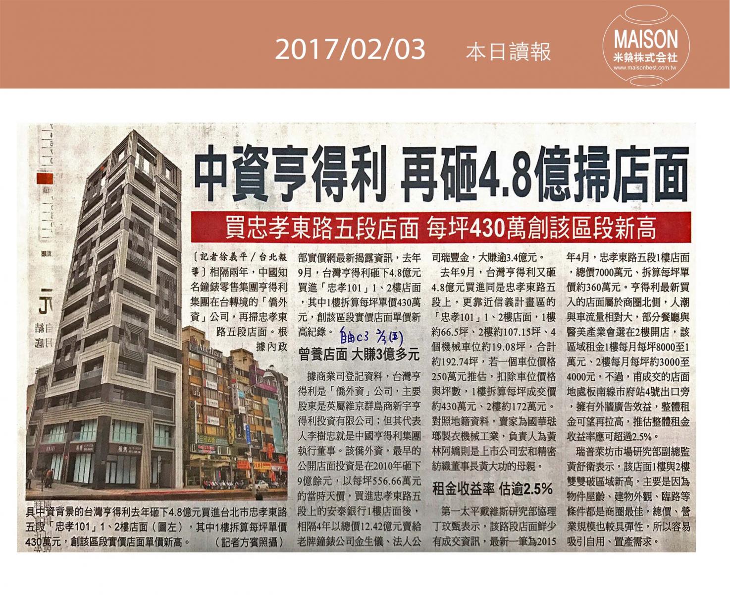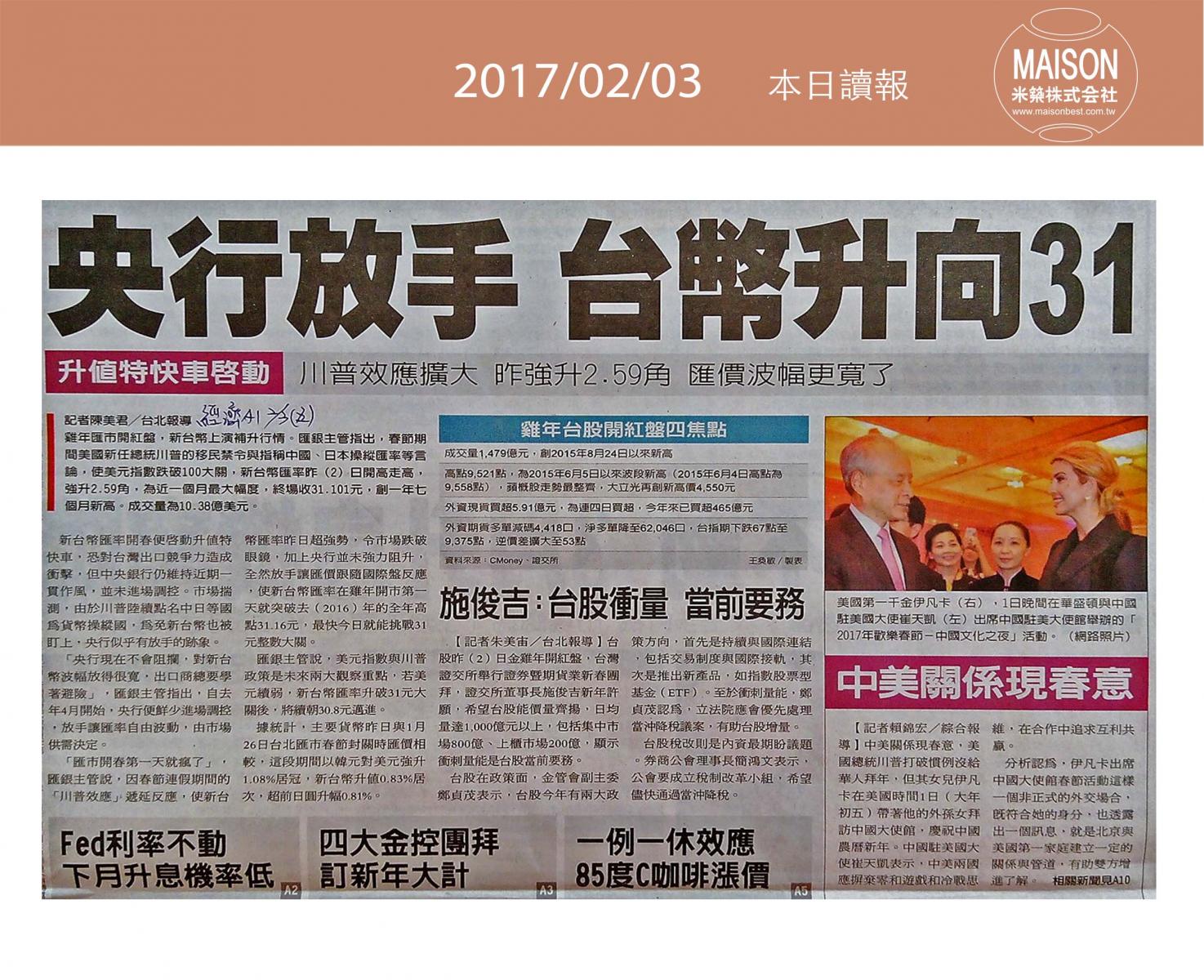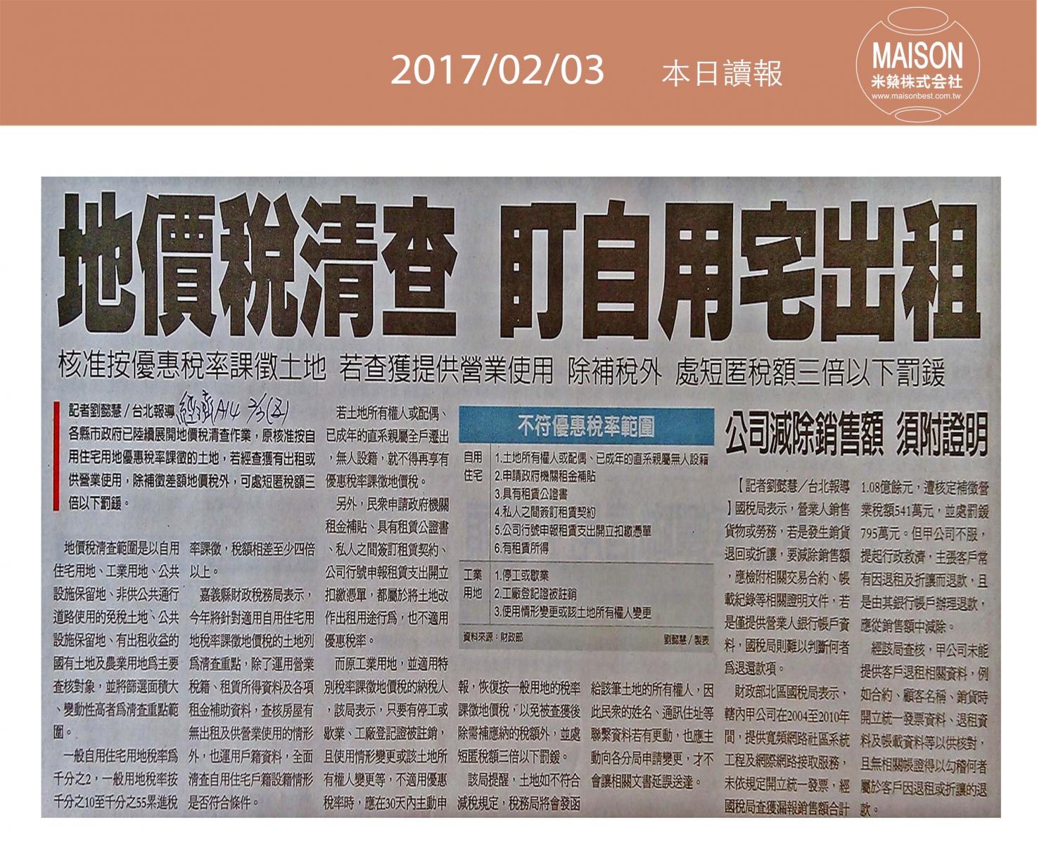 今日新聞重點:6都元月房市開紅盤 新北交易量年增7成;地價稅查清 盯自用宅出租;今年經濟成長率 拼2.5%;潤泰新國建興富發 砸60億獵地;央行放手 台幣升向31;六都一月移轉棟數年成長飆37.5%;中資亨得利 再砸 4.8億掃店面!