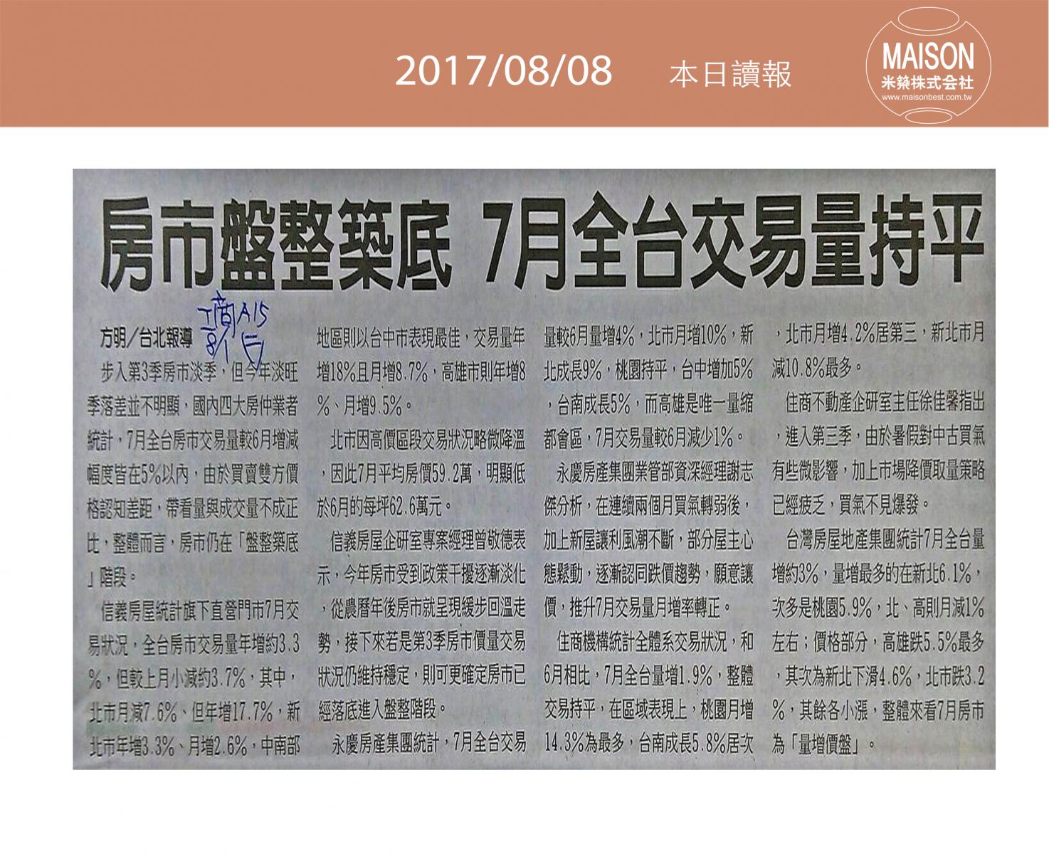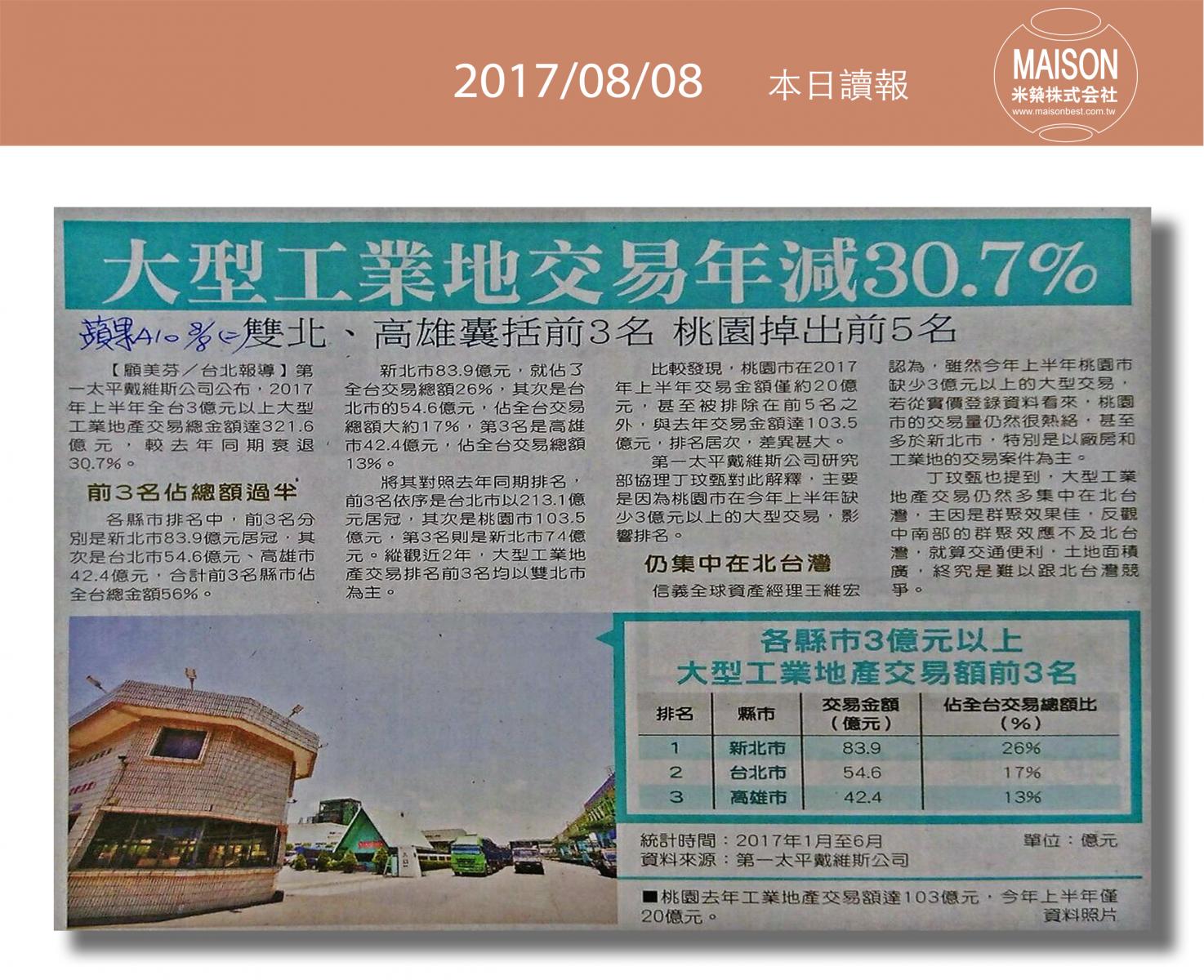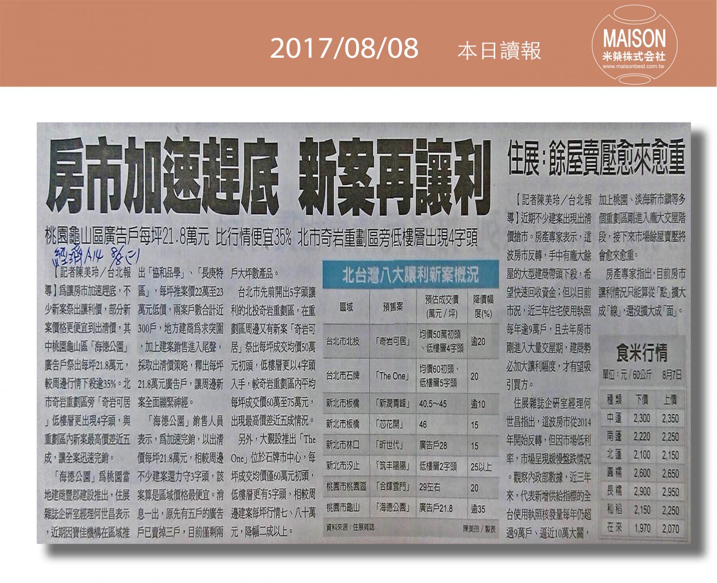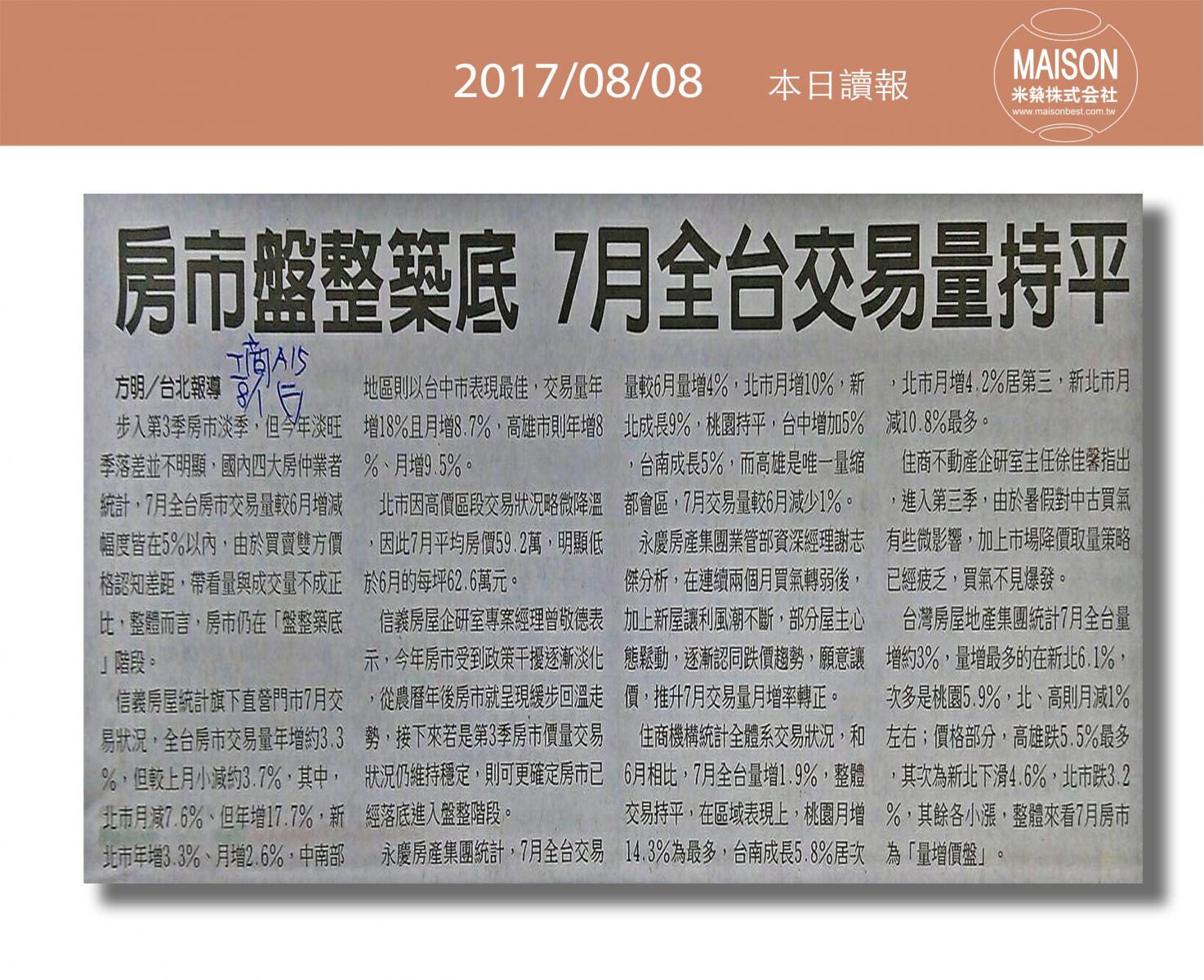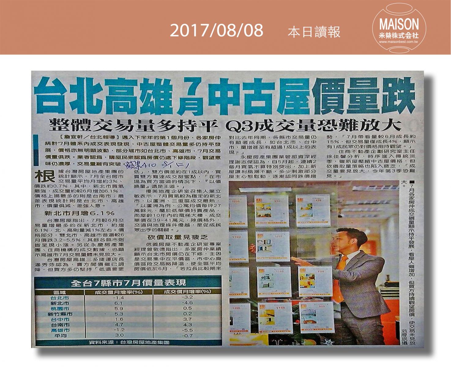 今日讀報(8/08)!1分鐘掌握財經房態今日新聞重點:房市加速趕底 新案再讓利:大型工業地交易年減30.7%:台北高雄7月 中古屋價量跌:房價改實坪制 暫不推動:單身族變多 小套房授信解禁:房市盤整築底 7月全台交易量持平:台中7其名人巷 知名品牌徵插旗……