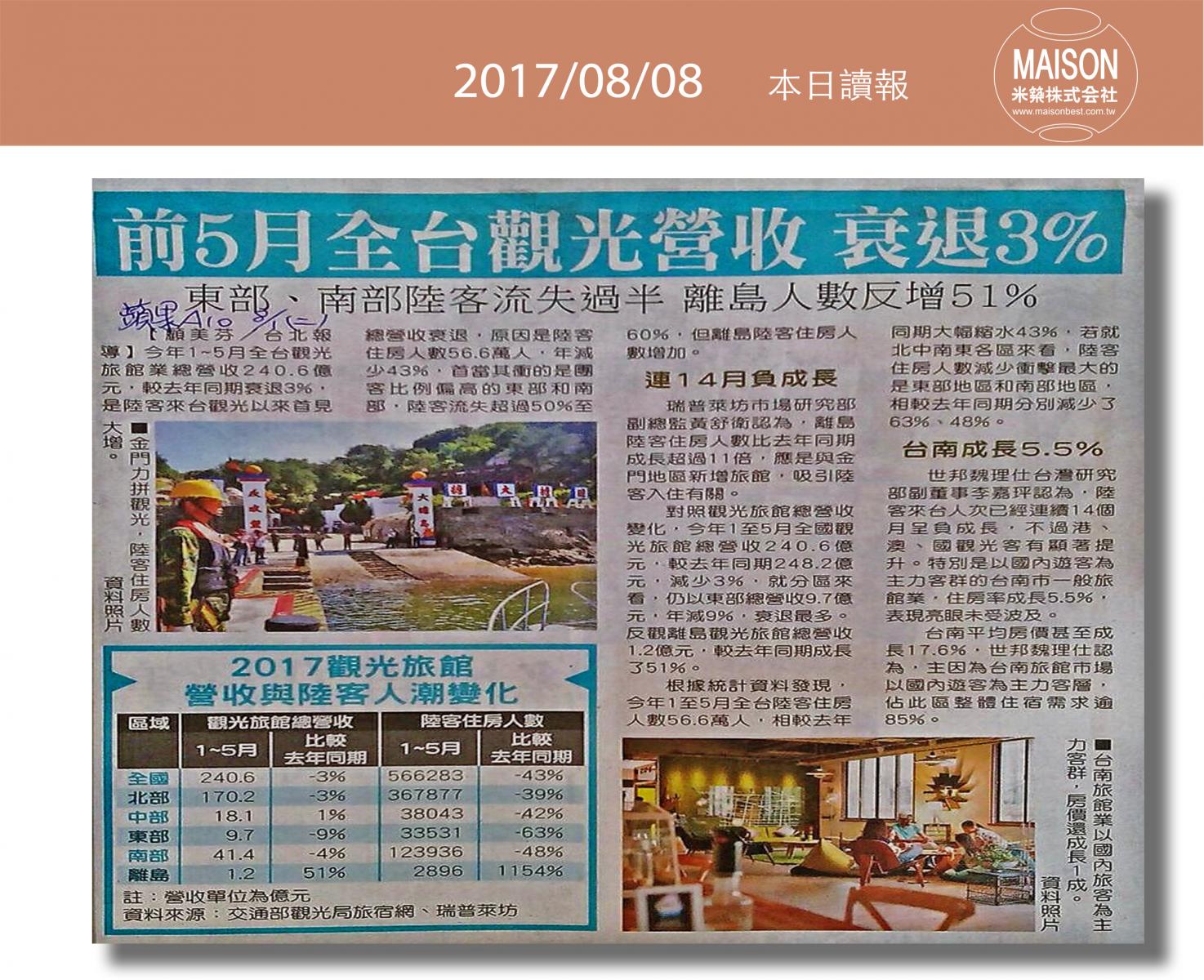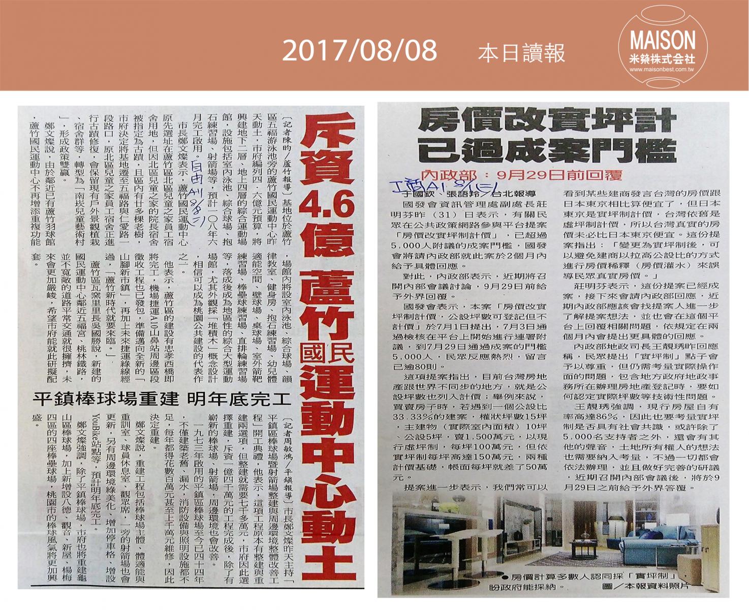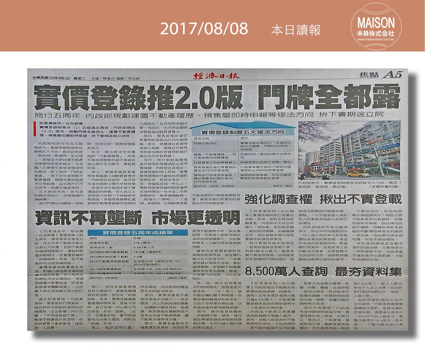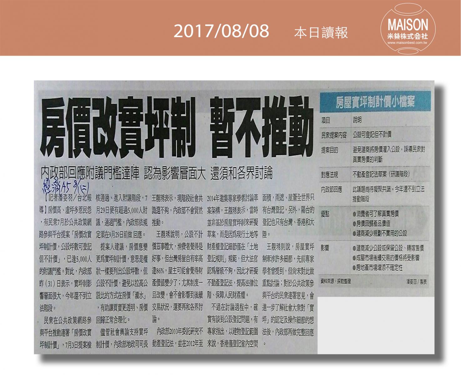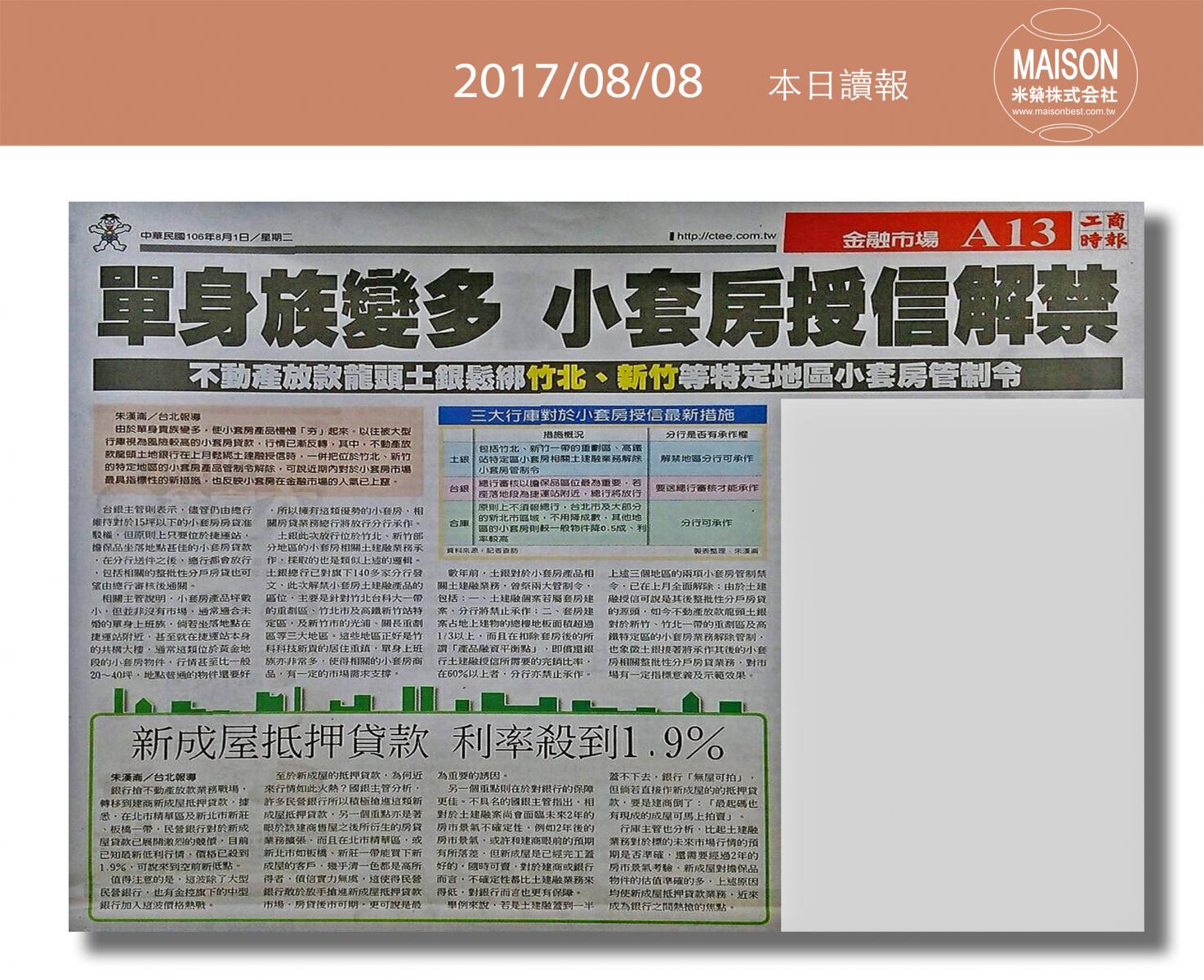今日讀報(8/08)!1分鐘掌握財經房態今日新聞重點:房市加速趕底 新案再讓利:大型工業地交易年減30.7%:台北高雄7月 中古屋價量跌:房價改實坪制 暫不推動:單身族變多 小套房授信解禁:房市盤整築底 7月全台交易量持平:台中7其名人巷 知名品牌徵插旗……