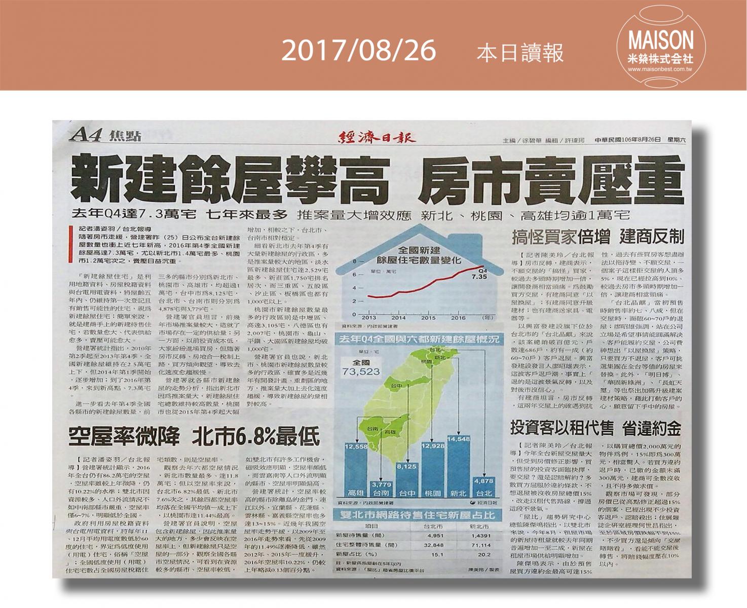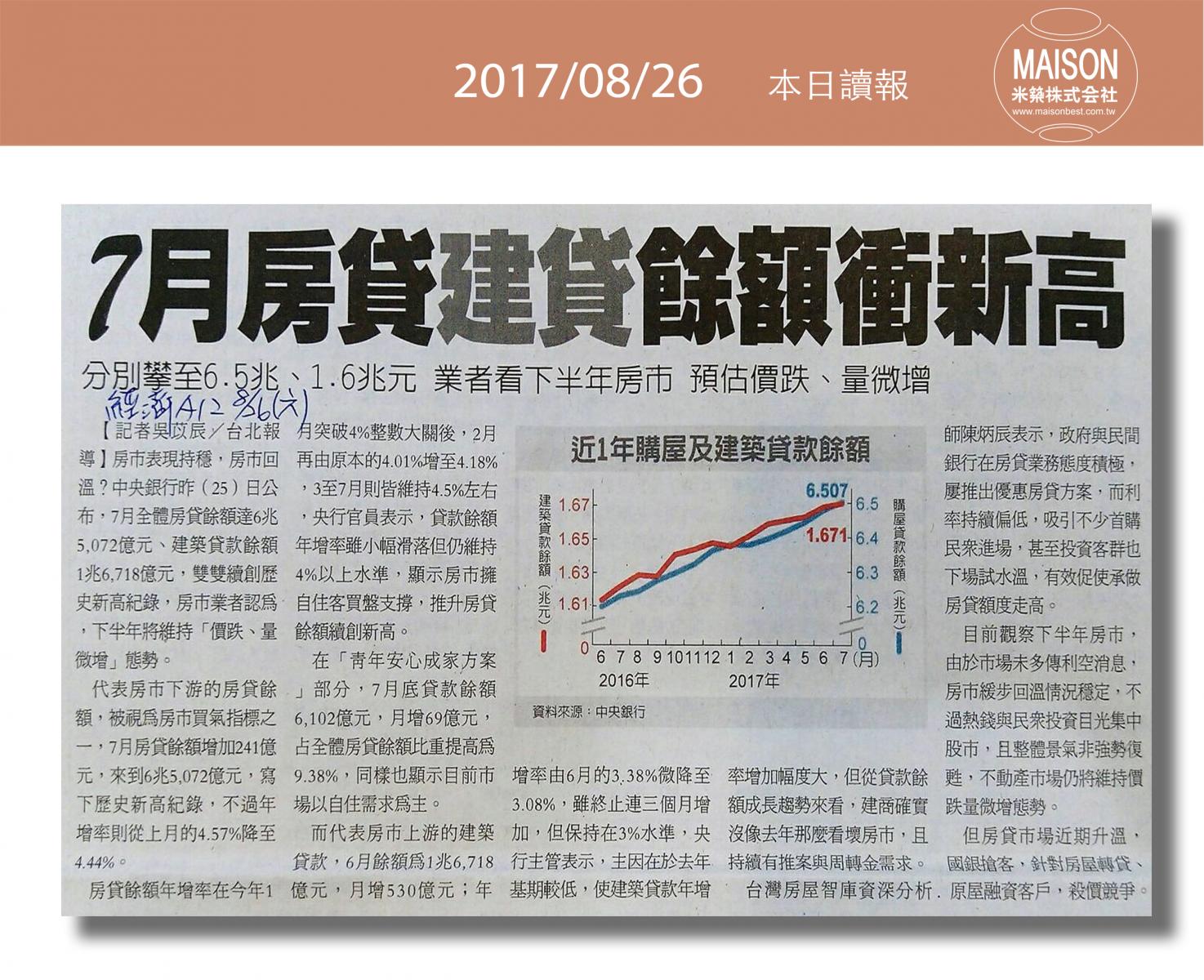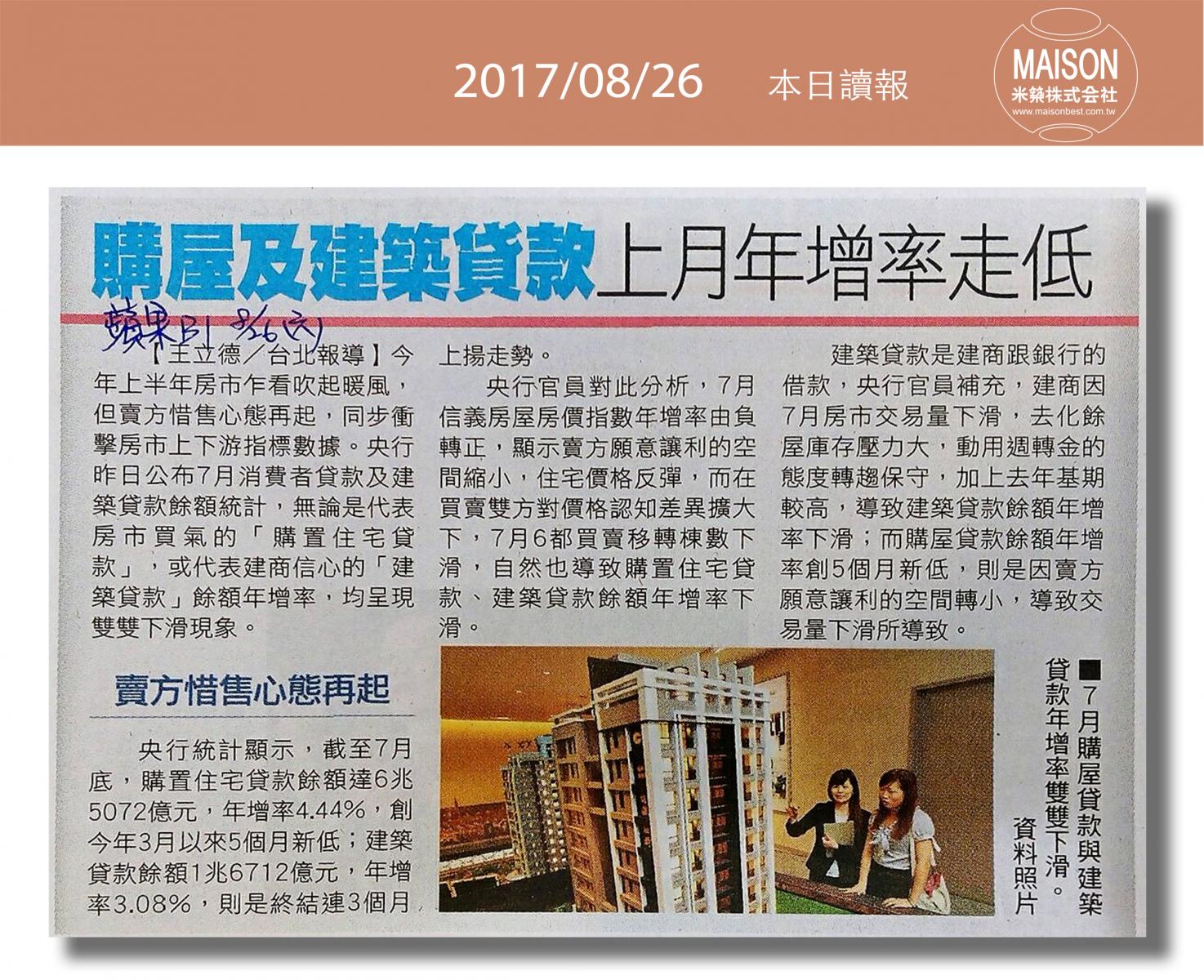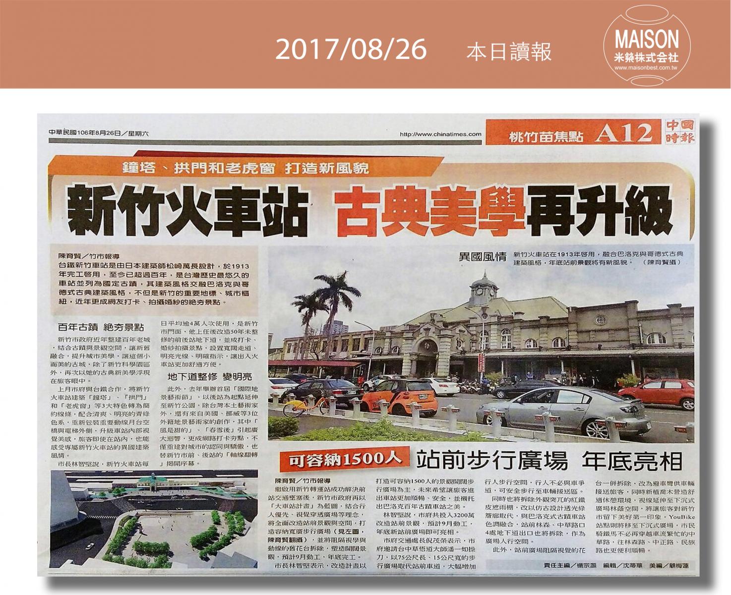 今日讀報(8/26)!1分鐘掌握財經房態今日新聞重點:新竹火車站 古典美學再升級:購屋及建築貸款上月年增率走低:新建餘屋攀高 房市賣壓重:營建業景氣 3年半來最旺:借屋裝修問題多:逾6成情侶願共同買房 小宅含裝潢交通便利最吸睛:七夕旺桃花居家東南方擺花戀愛加分……