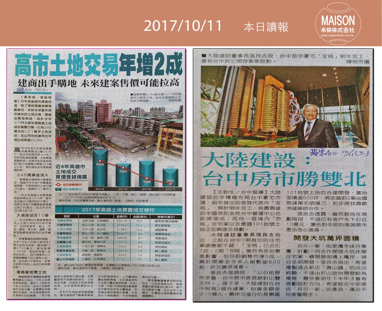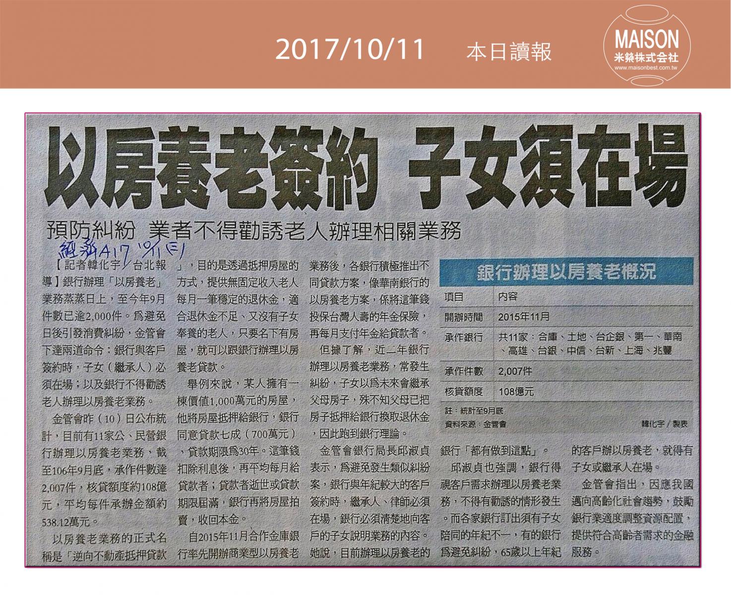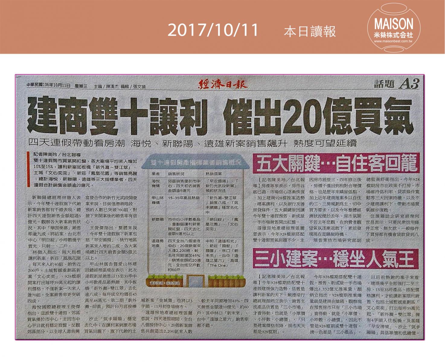 今日新聞重點:建商雙十讓利 催出20億買氣:以房養老 前三季核貸破百億:以房養老簽約 子女須在場:台北車站商圈 飯店爭相搶進:高市土地交易年增兩成:「房市有溫度沒熱度」!